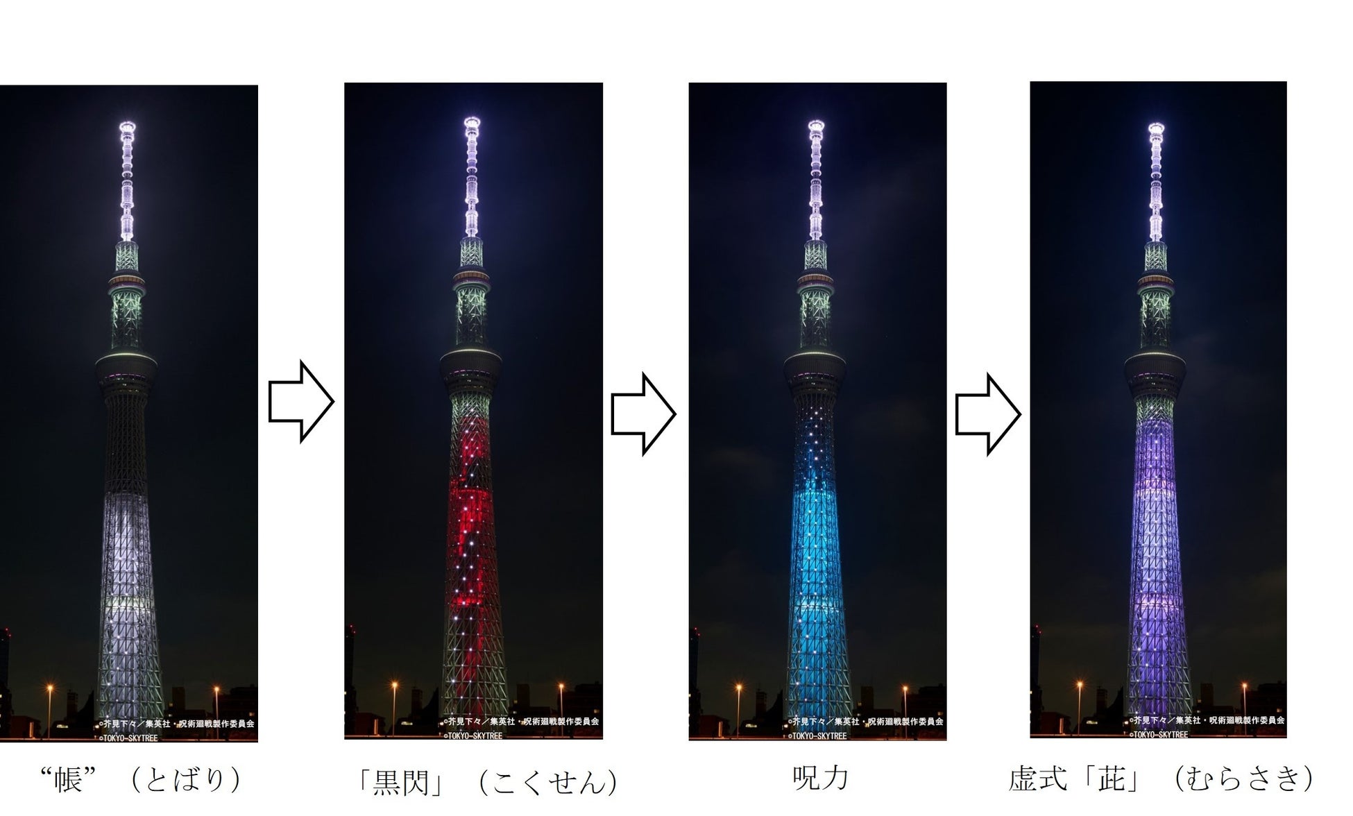 TVアニメ「呪術廻戦」をイメージさせる4種類の特別ライティングを3分1セットで繰り返し点灯します。