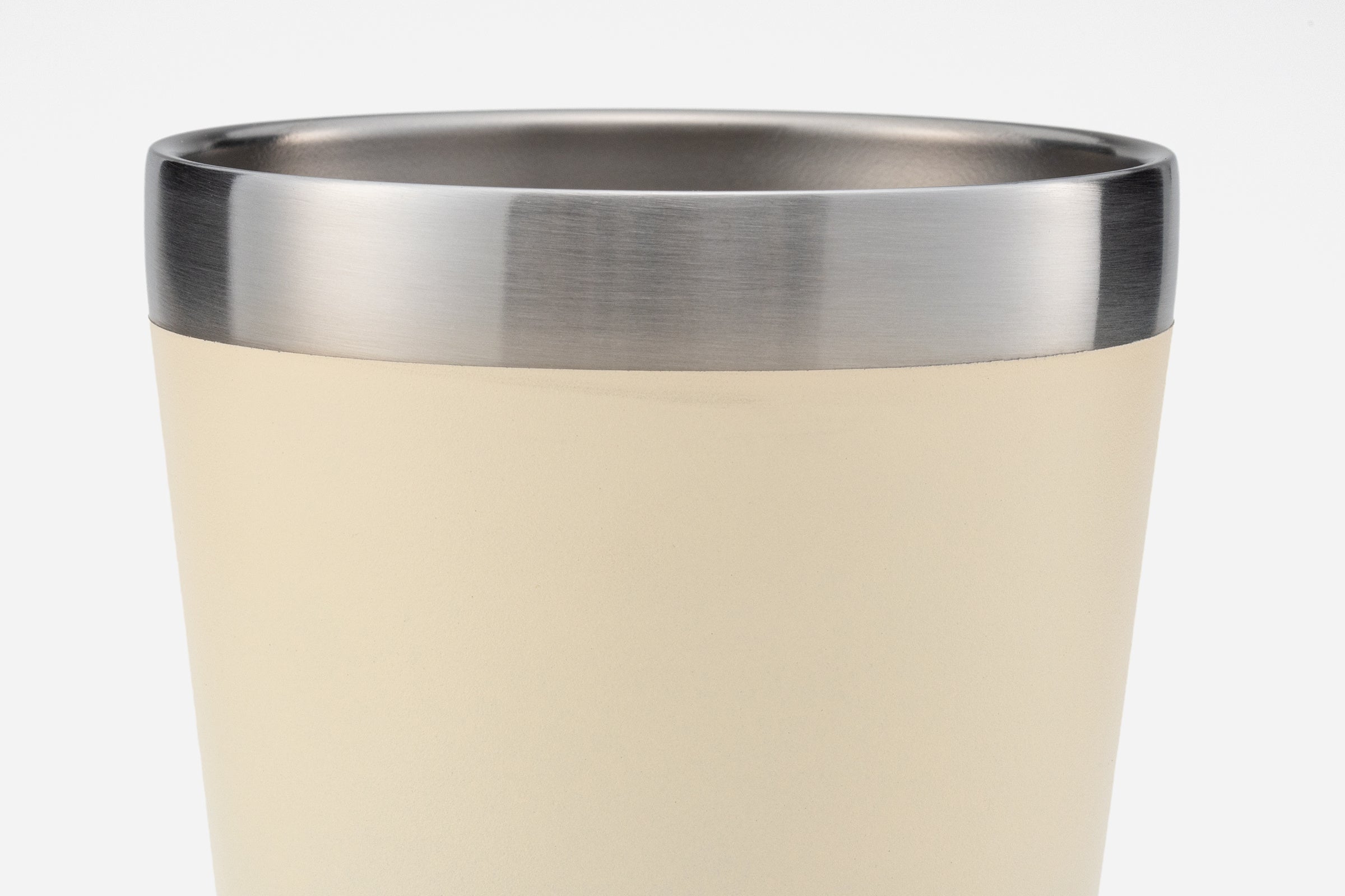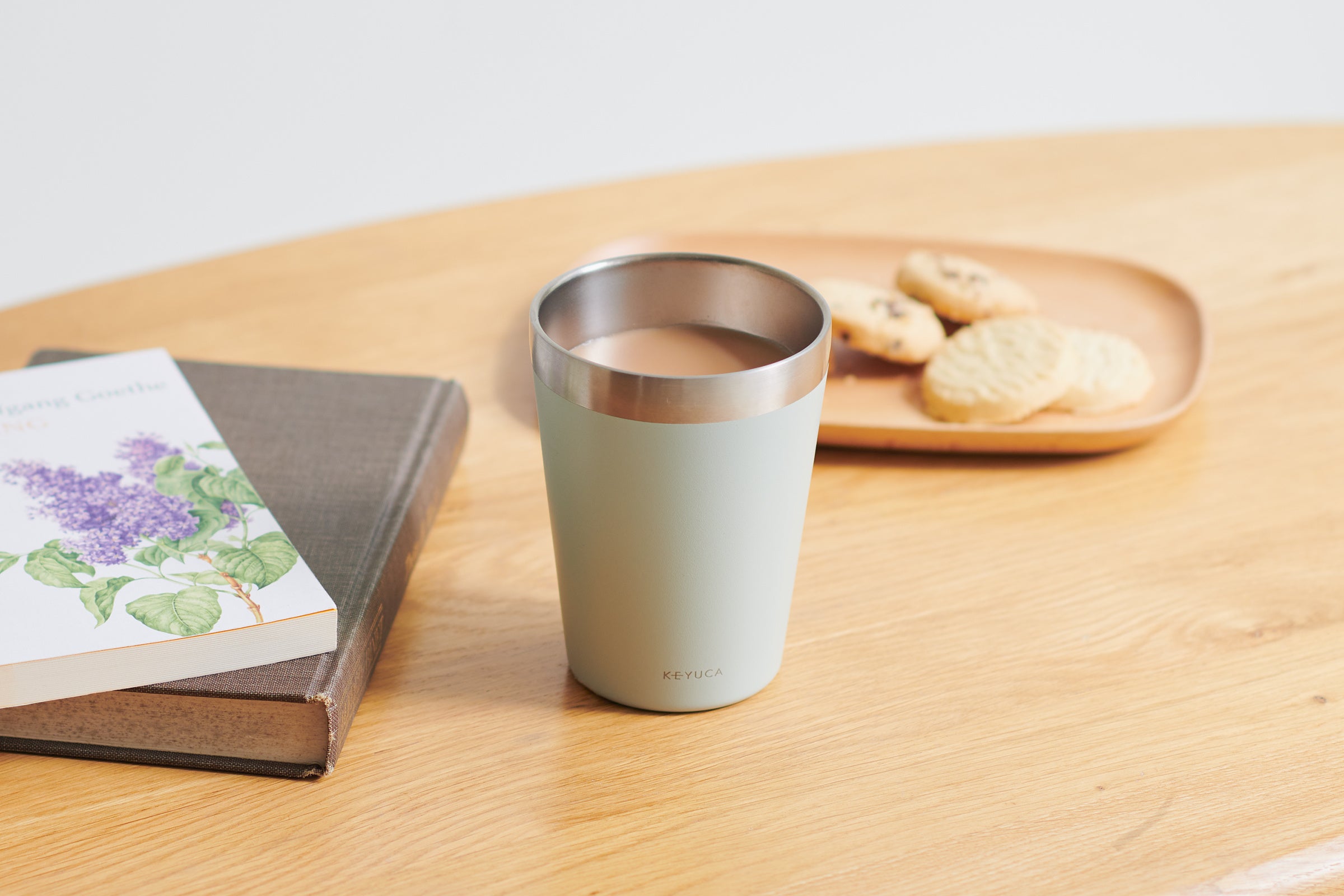 真空2層構造になっているため、保温保冷効果があり、季節を問わず飲み物を長時間美味しくお楽しみいただけます。さらに、冷たい飲み物をいれた際は、暑い夏でも結露を防ぐことができ、持ち運びやオフィスのデスクでご活用いただくのにもぴったりです。また、本体部分は、ざらつきのある塗装で仕上げ、手に持った時の質感にもこだわりました。飲み口は、無装飾にすることによって、心地よい口当たりを実現。飲み物や口紅などの着色汚れも防ぎます。