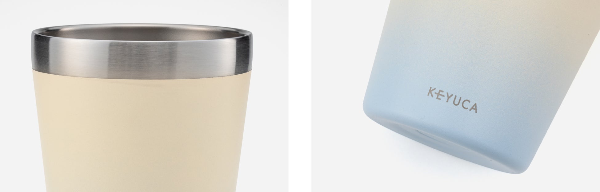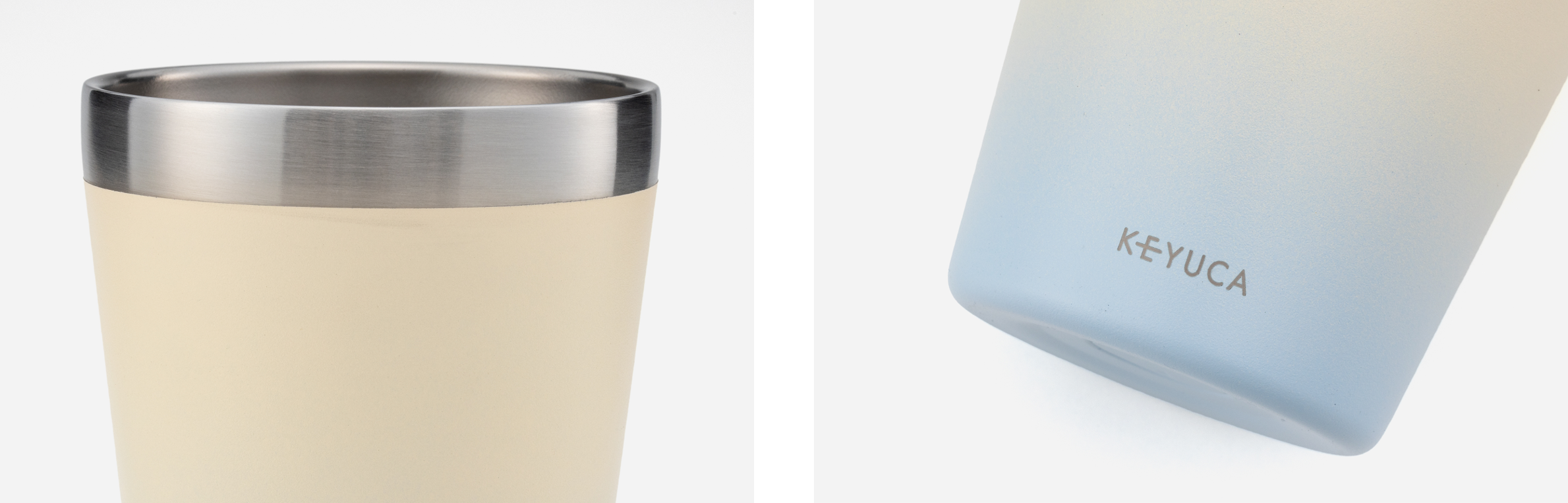 また、お客様にとって「ちょうどいい」を作るブランドとして、 細部のデザインにも工夫を凝らしています。飲み口は、あえて無装飾にすることで、飲み物や口紅などがつきづらくなっており、本体部分は少しざらつきのある塗装を施すことで、手に持った時に心地よい質感に仕上げました。