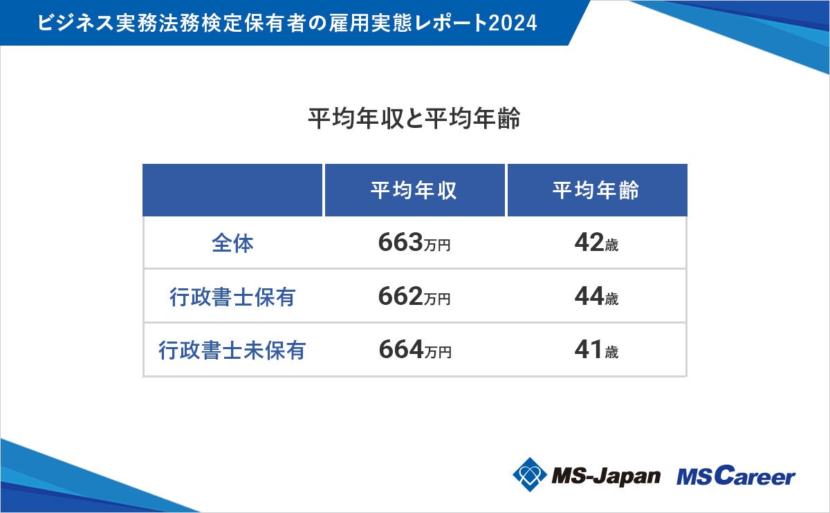 まず、ビジネス実務法務検定保有者の平均年収は663万円、平均年齢は42歳でした。