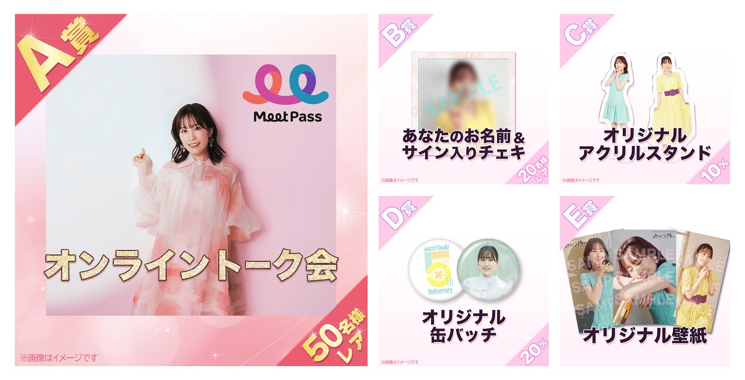 他にもここでしか手に入らない『あなたのお名前&サイン入りチェキ』や、3rdアルバム 「fruitful spring」やニューシングル 「ミュージカル」の未公開アザーカット・5周年ロゴなどを使用した『オリジナル缶バッジ』、本くじ用に撮り下ろしした素材を使った『アクリルスタンド』や『オリジナル壁紙』など、いずれかの賞品がもれなく当たるハズレなしのくじとなります。