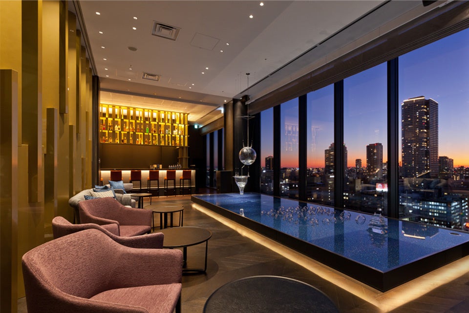 大阪のメインストリート・御堂筋沿いに2019年11月にオープンした大阪エクセルホテル東急の16階にあるBAR&LOUNGE MIDO(ミドウ)。西へ全面にとった窓からは、六甲山に沈む夕日や大阪の夜景が一望できます。水都大阪をイメージした水盤、職人技が光る天満切子の照明が織りなすドラマチックな空間で至極の一杯をお愉しみください。