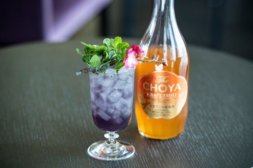 オリジナルカクテル「CHOYA×Champagne Mojito」(チョーヤ×シャンパンモヒート)は、ライムの代わりに梅酒の酸味を活かし、炭酸水ではなくシャンパンを満たしてつくります。完熟梅ピューレの濃厚でフルーティーな味わいをスッキリとしたシャンパンが引き立て、クラッシュアイスとミントの爽快感でモヒート風にアレンジしました。菫のリキュールの鮮やかな紫色がシャンパンの繊細な泡とともにグラスの中できらめく、華やかなカクテルに仕上げました。