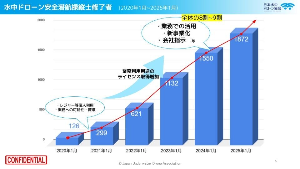 受講者数は全国で増加傾向にあります。それは日本国内においても水中ドローンの認知が高まり、水中産業のニーズも増えてきている事の裏付けでもあるといえます。