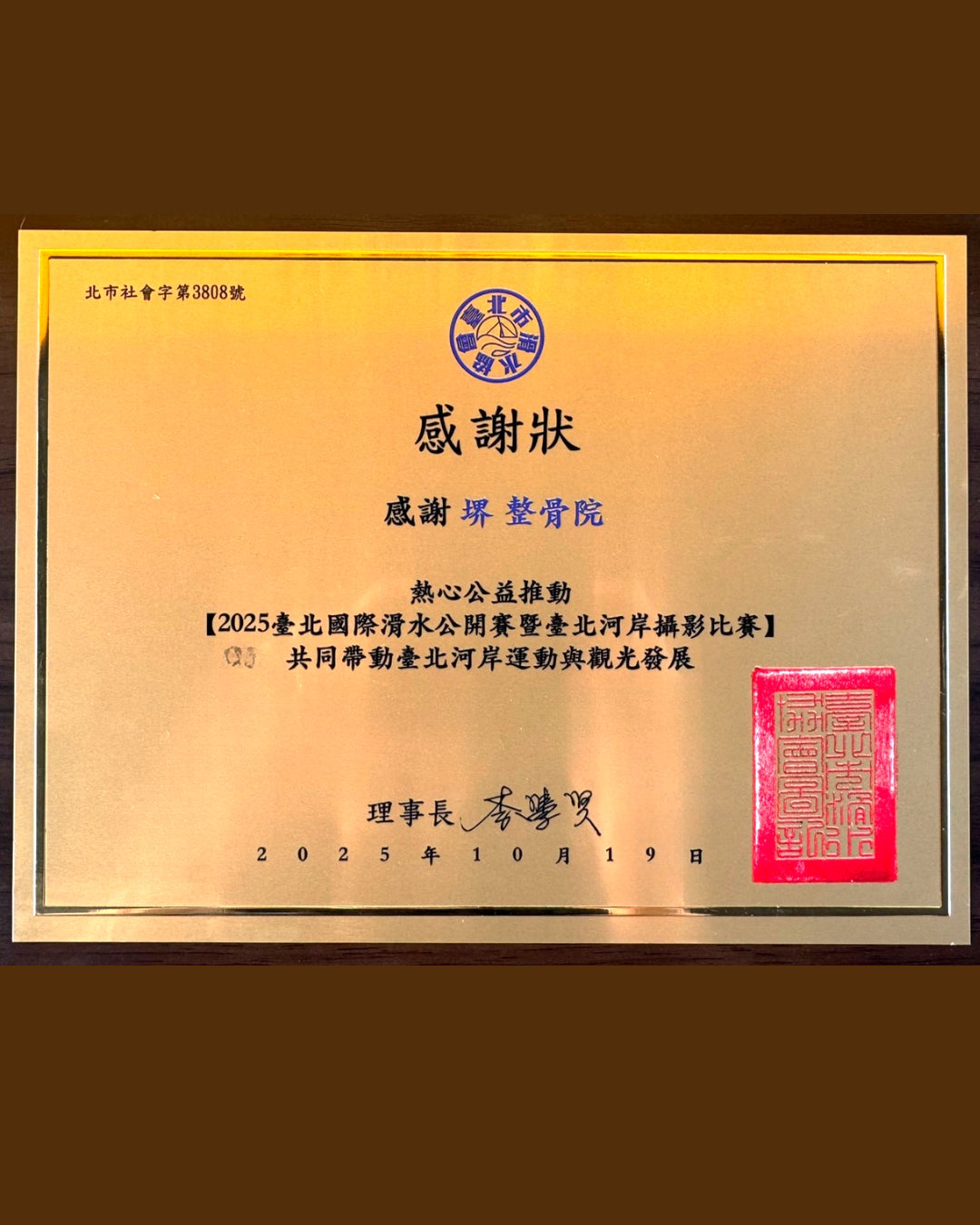 台北市の水上スポーツ協会から、台北の水上スポーツと観光の発展を推進したとして、堺整骨院グループに感謝状が贈られました。