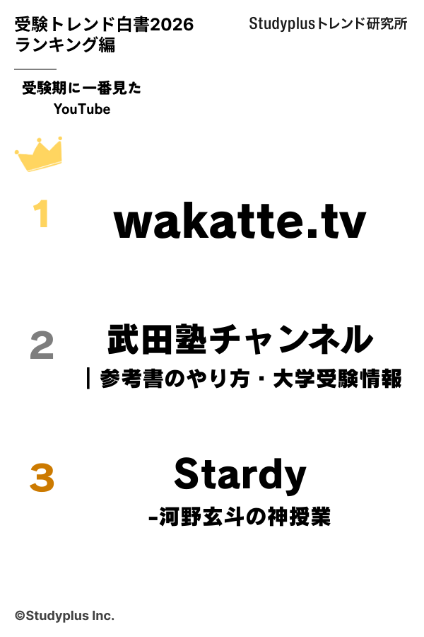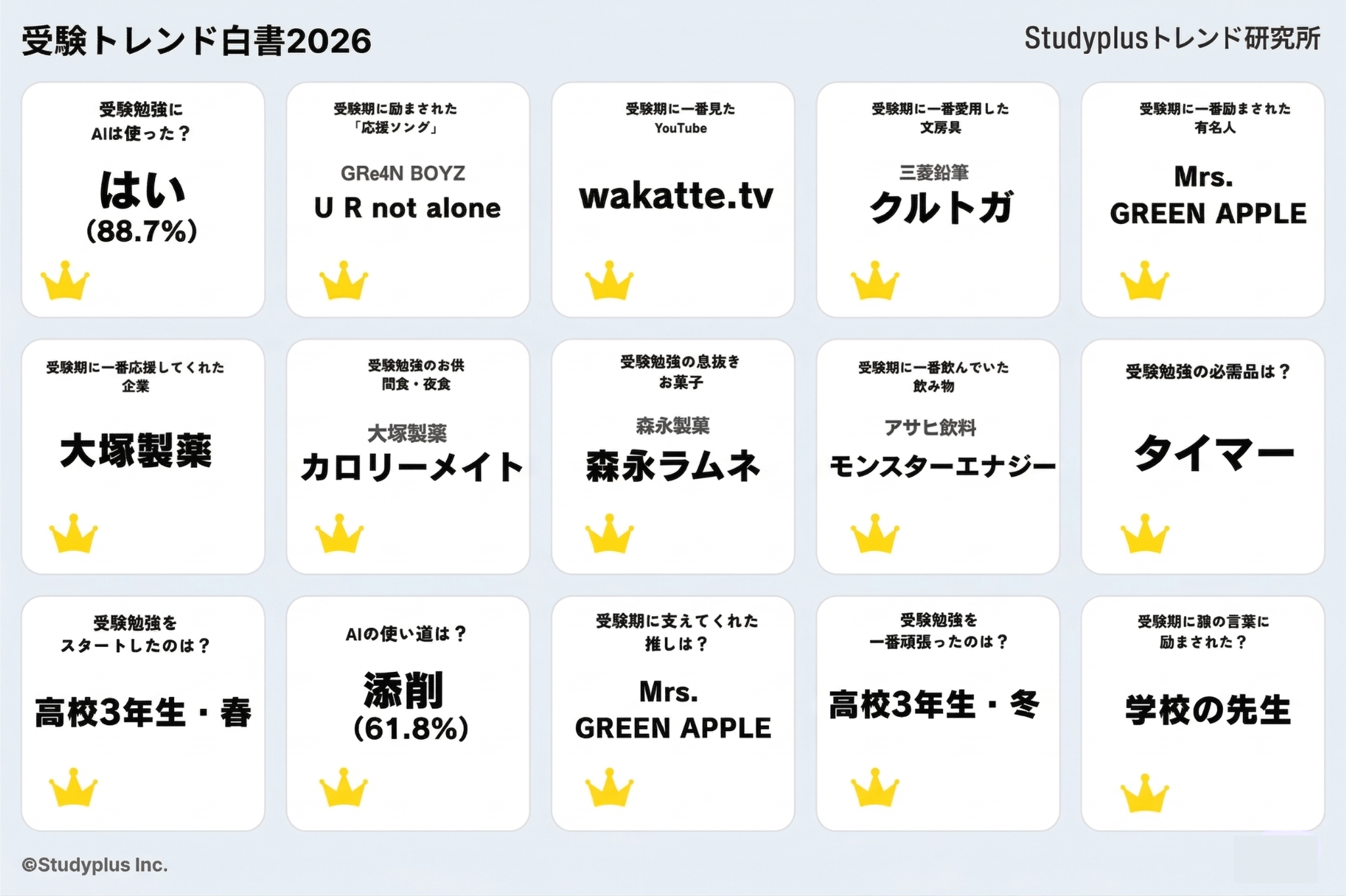 スタディプラス株式会社(本社:東京都千代田区、代表取締役:廣瀬高志、以下スタディプラス)のStudyplusトレンド研究所は、2026年2月10日(火)から2026年3月10日(火)にかけて学習管理アプリ「Studyplus」上で、2025年度に大学受験をしたユーザー3,000名を対象に「大学受験期のトレンドに関する調査」を実施、結果を「受験トレンド白書2026」としてまとめましたので、ご報告いたします。