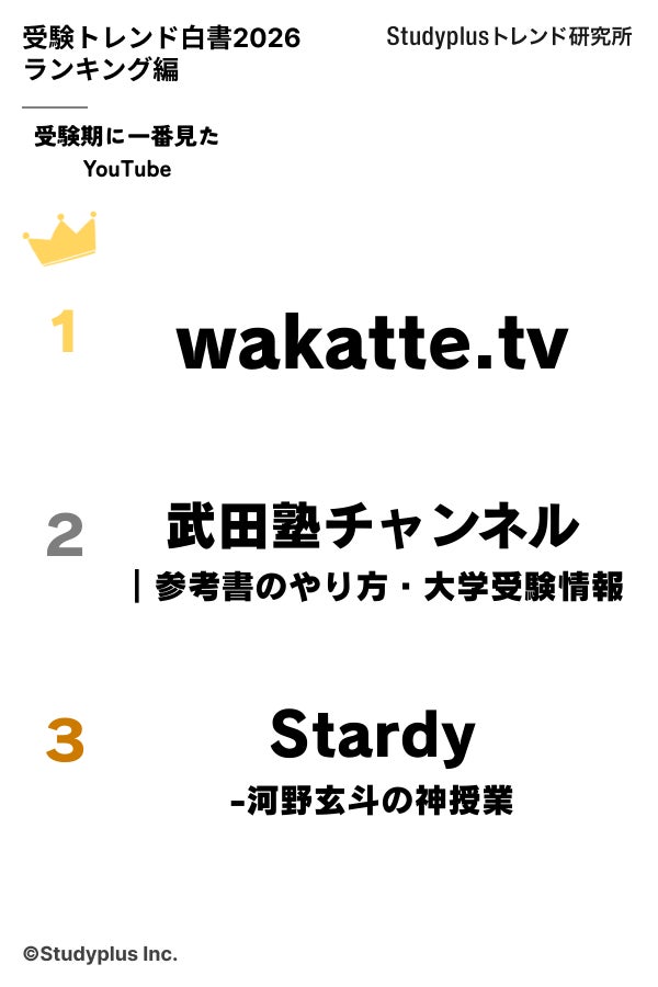 「wakatte.tv」が1位となりました。受験情報の収集だけでなく、受験生のモチベーション維持にも貢献しています。2位には昨年1位の「武田塾チャンネル」、3位には河野玄斗さんの「Stardy-河野玄斗の神授業」が続きました。上位の顔ぶれは定番化していますが、4位の「雷獣」は今年初めてのランクインとなりました。