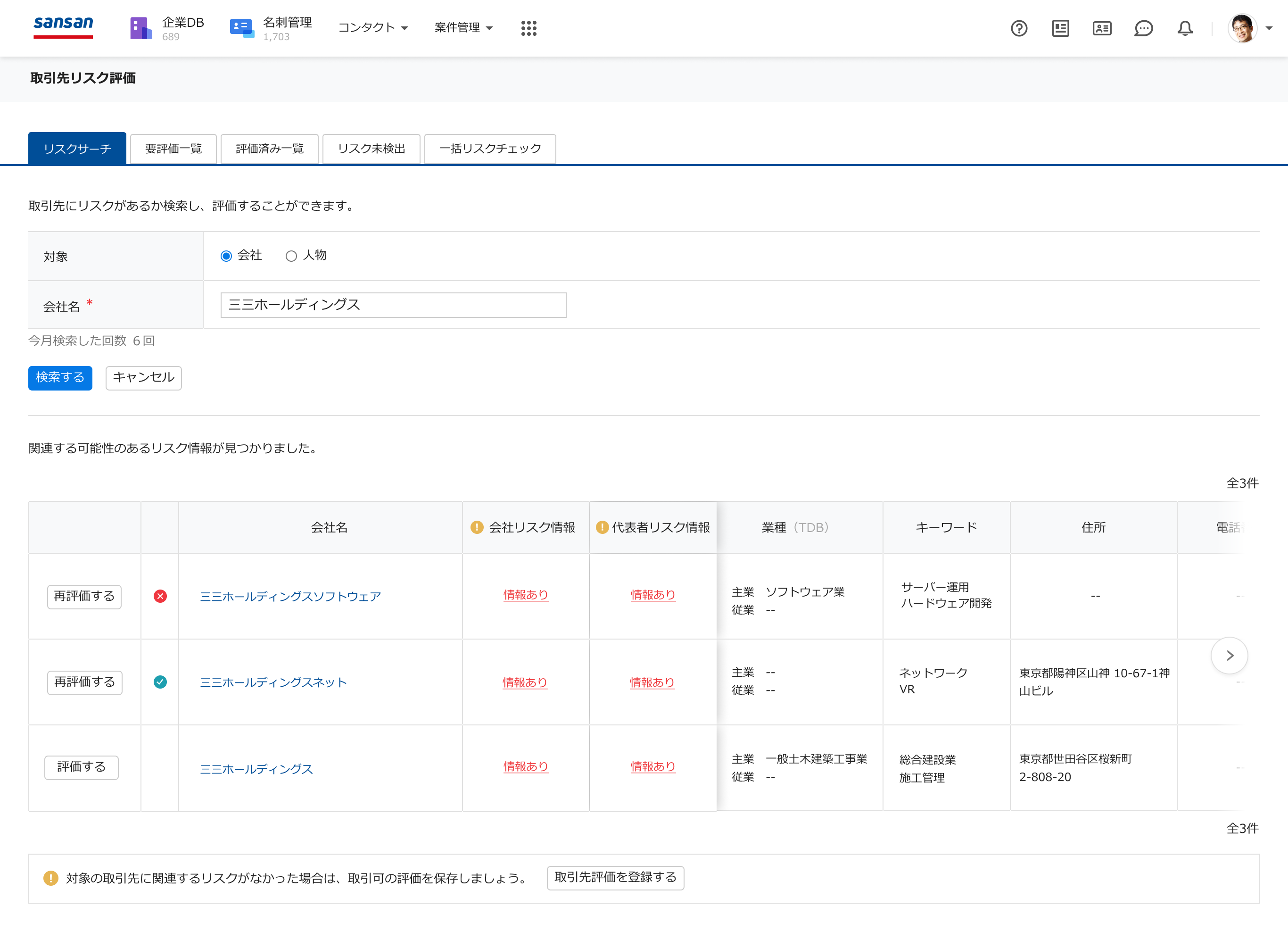 ・接点のない企業についても、Sansan上で取引リスクの有無の確認が可能