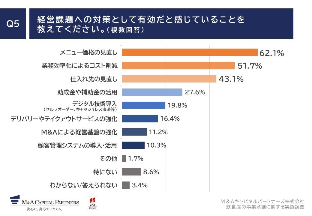 Q4で「特にない」「わからない/答えられない」以外を回答した方に、「Q5.経営課題への対策として有効だと感じていることを教えてください。(複数回答)」(n=116)と質問したところ、「メニュー価格の見直し」が62.1%、「業務効率化によるコスト削減」が51.7%、「仕入れ先の見直し」が43.1%という回答となりました。