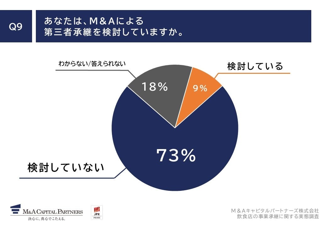 「Q9.あなたは、M&Aによる第三者承継を検討していますか。」(n=122)と質問したところ、「検討している」が9.0%、「検討していない」が73.0%という回答となりました。
