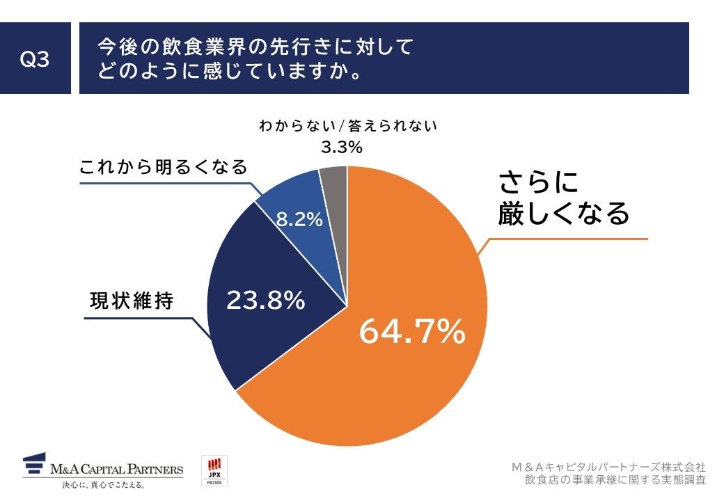 「Q3.今後の飲食業界の先行きに対してどのように感じていますか。」(n=122)と質問したところ、「さらに厳しくなる」が64.7%、「現状維持」が23.8%という回答となりました。