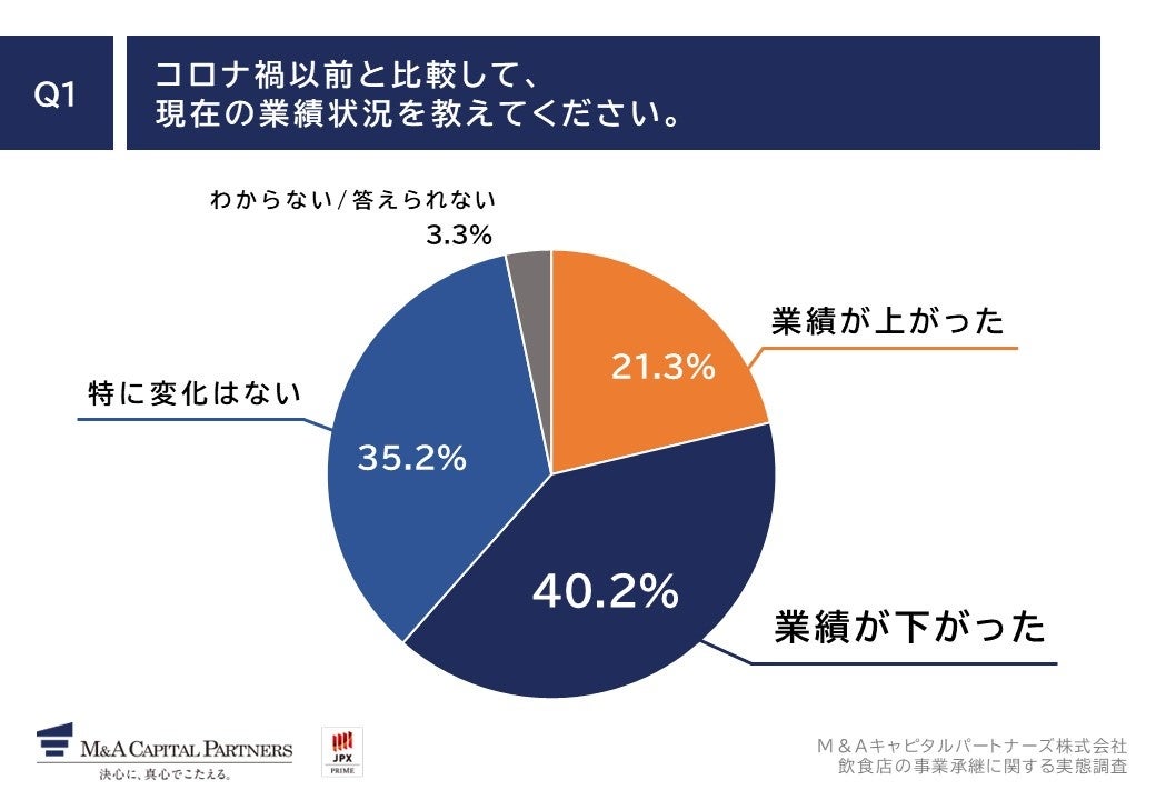 「Q1.コロナ禍以前と比較して、現在の業績状況を教えてください。」(n=122)と質問したところ、「業績が上がった」が21.3%、「業績が下がった」が40.2%という回答となりました。