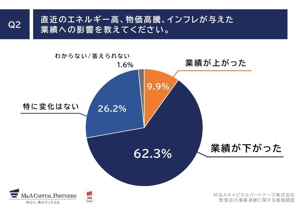 ■直近のエネルギー高、物価高騰、インフレにより「業績が下がった」飲食店経営者は、62.3%