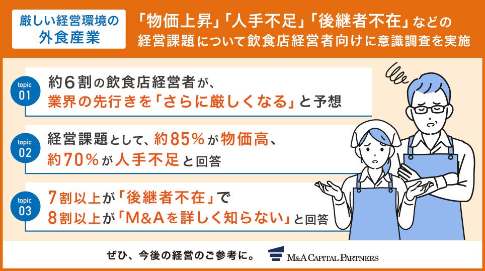 M&Aキャピタルパートナーズ株式会社(東京都中央区・代表取締役社長 中村悟)は、飲食店の経営者・役員122名を対象に、飲食業界の事業承継に関する実態調査を実施しましたので、お知らせいたします。