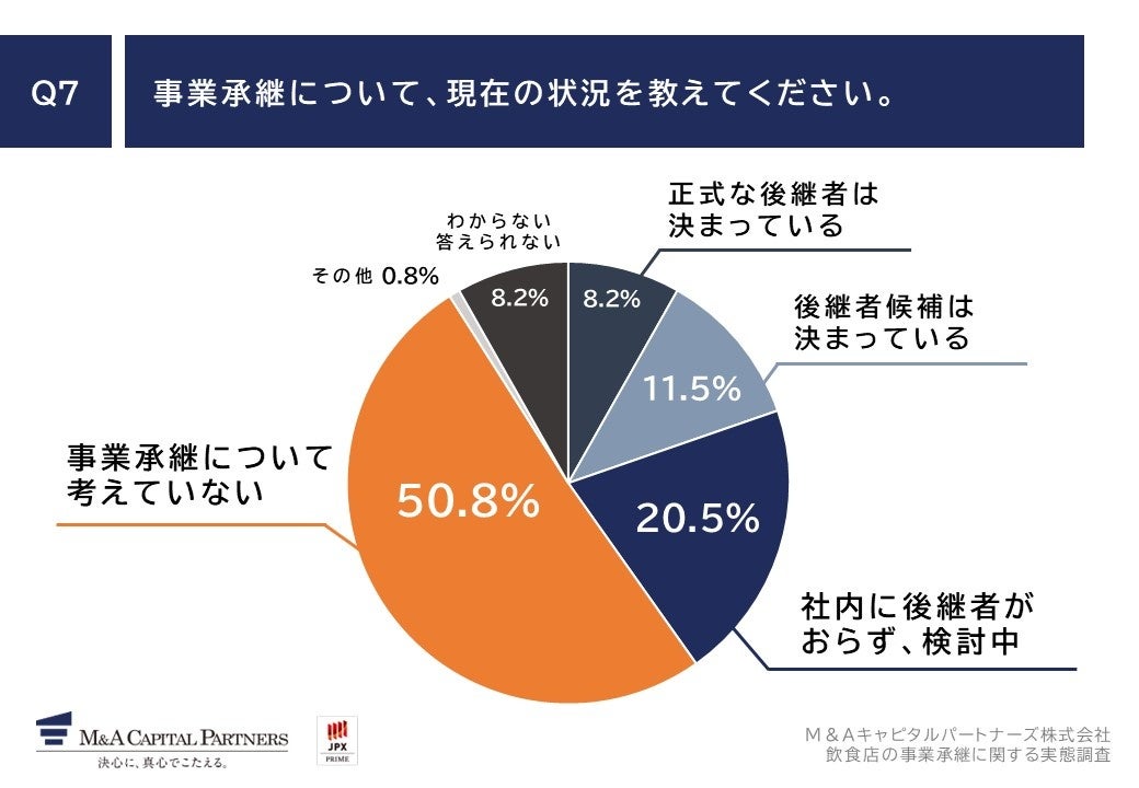 「Q7.事業承継について、現在の状況を教えてください。」(n=122)と質問したところ、「社内に後継者がおらず、検討中」が20.5%、「事業承継について考えていない」が50.8%という回答となりました。