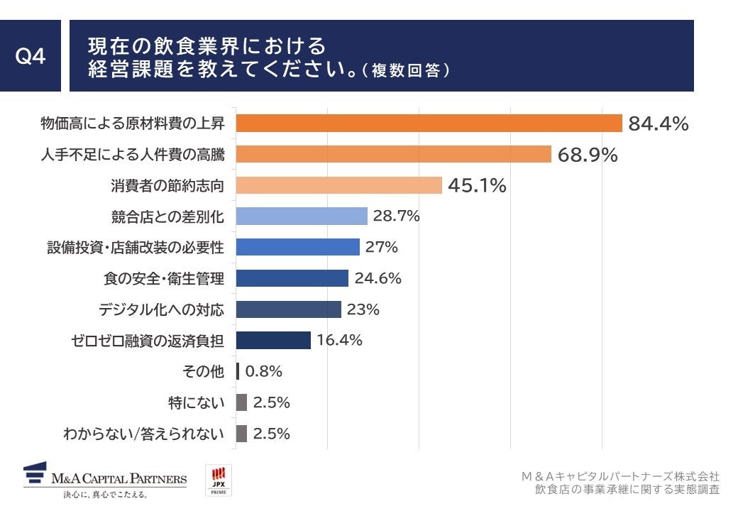 「Q4.現在の飲食業界における経営課題を教えてください。(複数回答)」(n=122)と質問したところ、「物価高による原材料費の上昇」が84.4%、「人手不足による人件費の高騰」が68.9%、「消費者の節約志向」が45.1%という回答となりました。