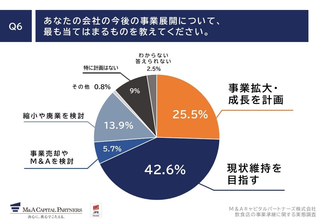 「Q6.あなたの会社の今後の事業展開について、最も当てはまるものを教えてください。」(n=122)と質問したところ、「事業拡大・成長を計画」が25.5%、「現状維持を目指す」が42.6%という回答となりました。