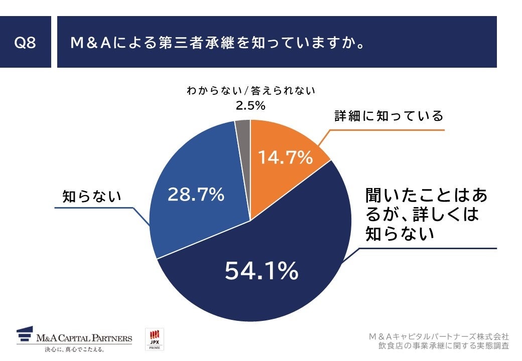 「Q8.M&Aによる第三者承継を知っていますか。」(n=122)と質問したところ、「聞いたことはあるが、詳しくは知らない」が54.1%、「知らない」が28.7%という回答となりました。