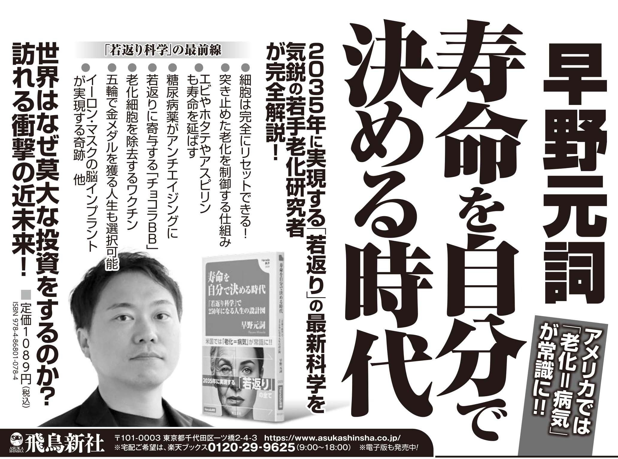 株式会社飛鳥新社(本社:東京都千代田区、代表取締役社長:土井尚久)は、書籍『寿命を自分で決める時代 「若返り科学」で250年になる人生の設計図』を4月25日に刊行しました。