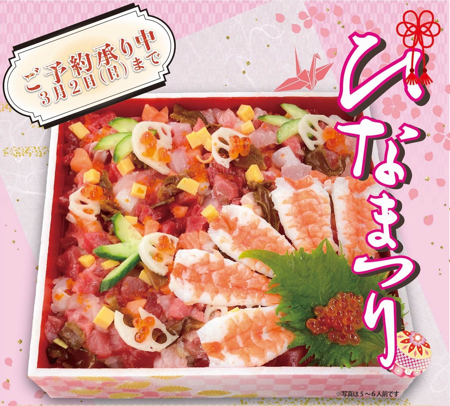 女の子の健やかな成長と幸せを願う日本の伝統行事「桃の節句」と言えば、お雛様や菱餅と並び、ちらし寿司を食べるのが定番です。『サカナタベタイ』では、産地とのネットワークや東京・豊洲市場での仕入れ力を駆使し、当社自慢の目利きが厳選した海鮮たっぷりの贅沢な海鮮を使用したひな祭り限定のちらし寿司を2店舗でそれぞれ販売いたします。2人前から5〜6人前までお用途に応じてサイズをお選びいただけますので、ひなまつりのお祝いに、魚屋さんのこだわりが詰まった豪華な「海鮮ちらし寿司」をぜひご賞味ください。