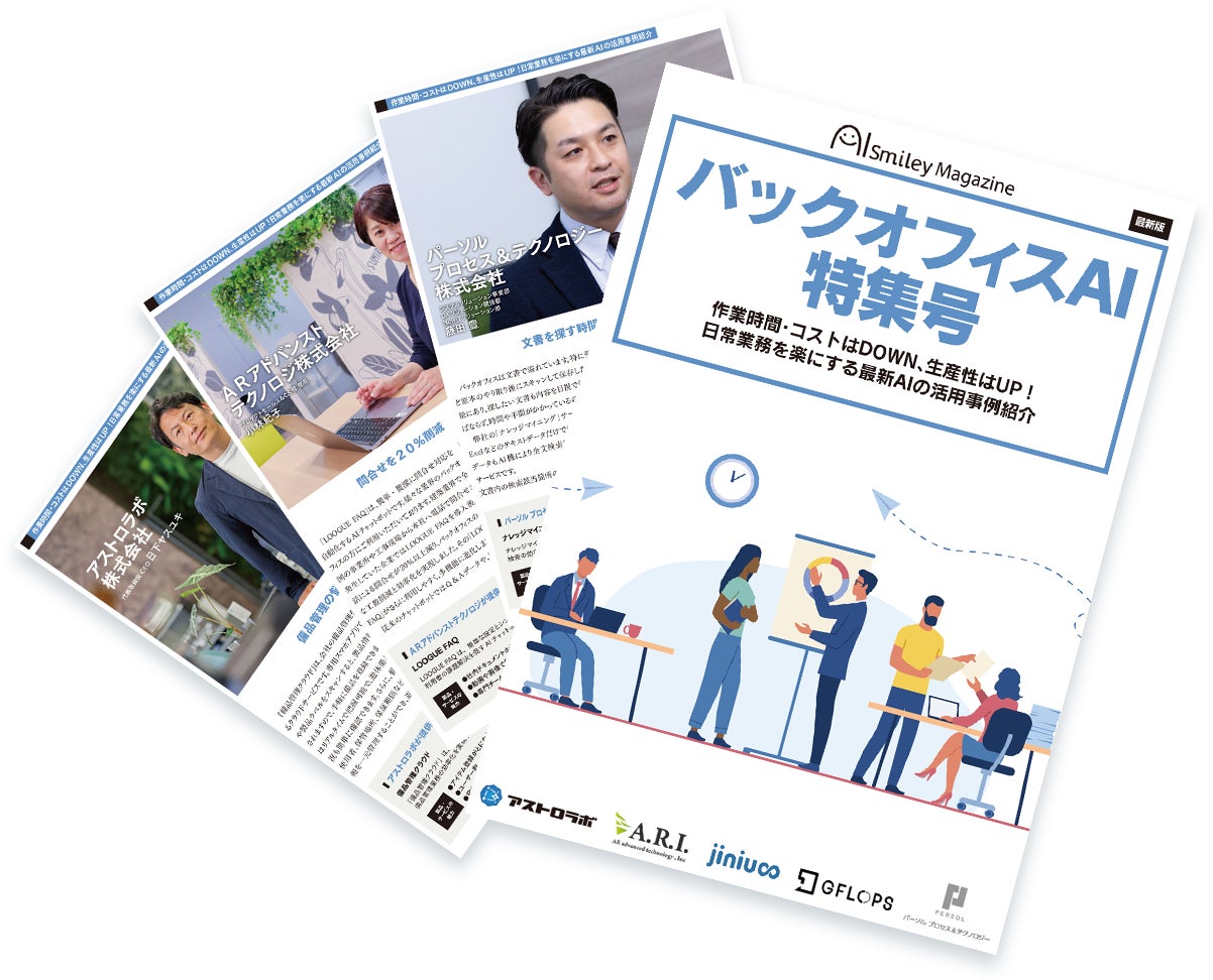 お問い合わせ完了後にご登録されたEメールにAIsmileyの担当から「バックオフィスAI特集号」(PDF)をメールにて送付させていただきます。