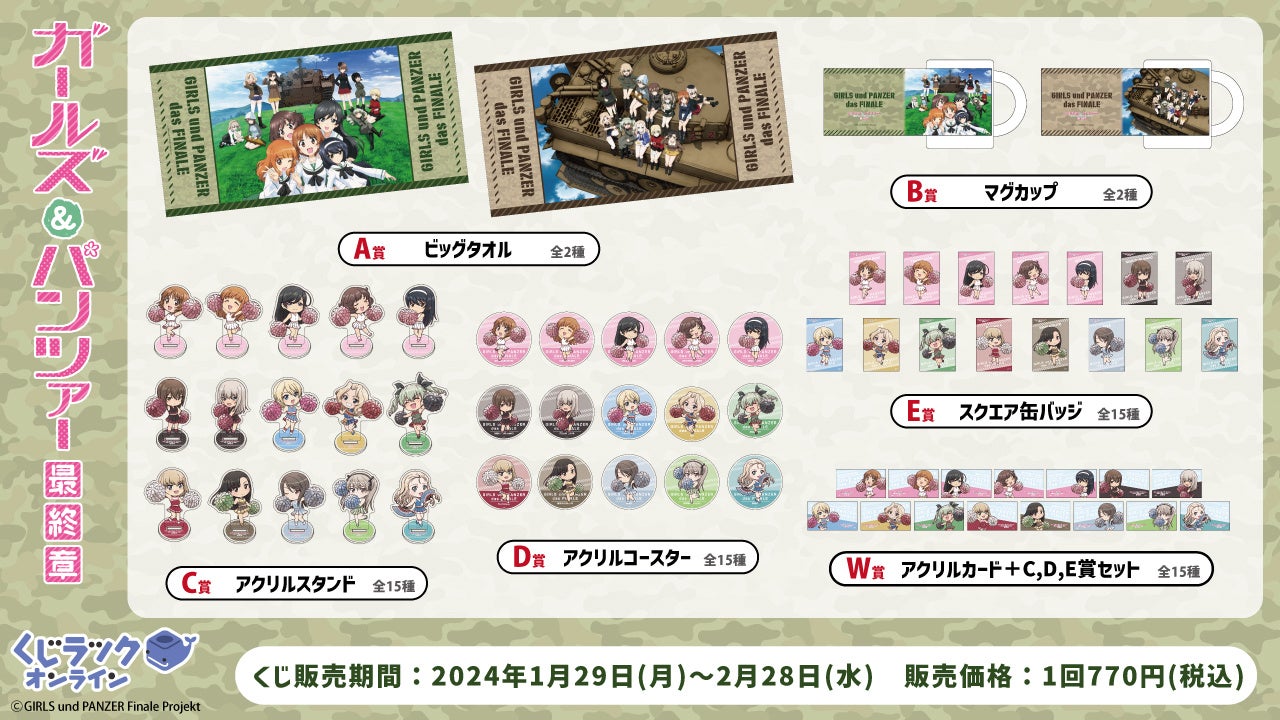カルチュア・エンタテインメント株式会社(以下、CE)は、アニメ『ガールズ&パンツァー 最終章』とコラボレーションした、ハズレ無しでキャラクターグッズがゲットできるオンラインくじ「くじラックオンライン」を2024年1月29日(月)より発売いたします。賞品は大洗女子学園やライバル校の計15名の人気キャラクターたちのイラストを使用したビッグタオルなど、全5アイテムとなっております。さらに、くじ1枚ご購入ごとにWチャンス賞の抽選が行われ、当選した方は特別な賞品が獲得できます。