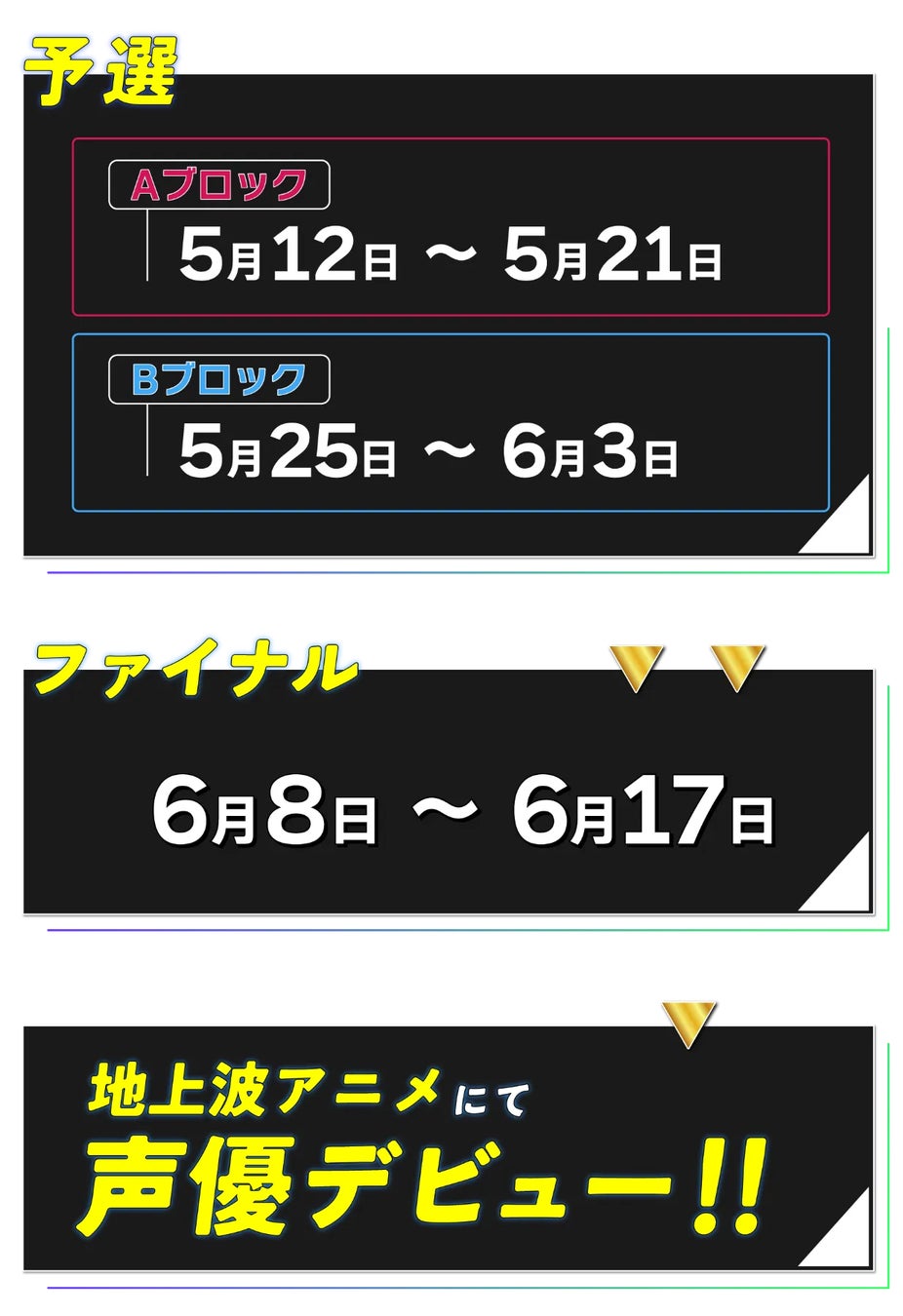 オーディション合格者は、地上波TVアニメ『DAYDREAMER or NiGHTTHiNKER』で人気声優と共演し、声優デビューが決定しております。そのほか、声優雑誌「声優グランプリ(Web)」でのインタビュー掲載やボイストレーニングなど、声優として活動いただくための豪華特典をご用意しております。