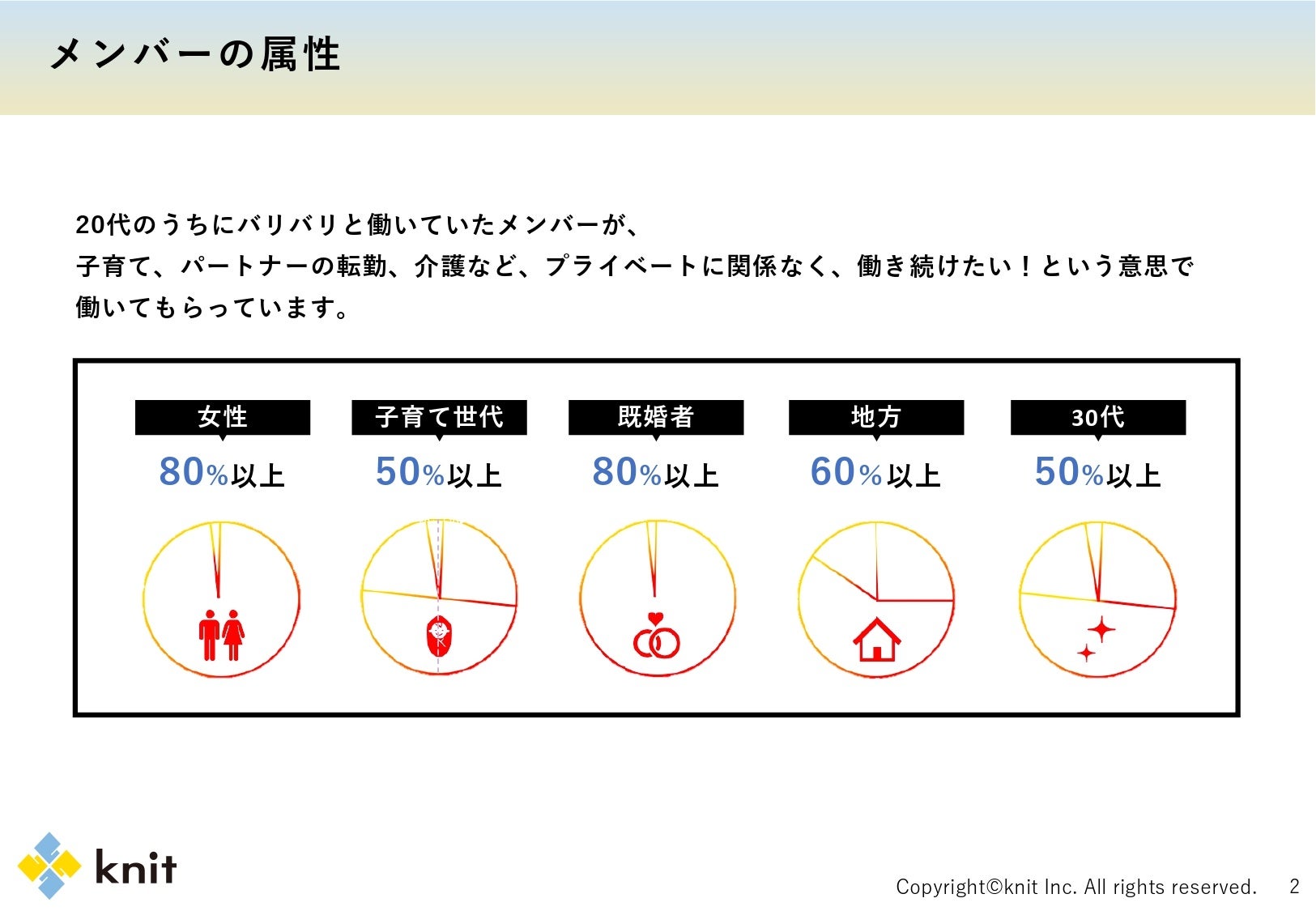 ニットで働いているメンバーの属性として、80%以上が女性、既婚者は60%以上を占めています。