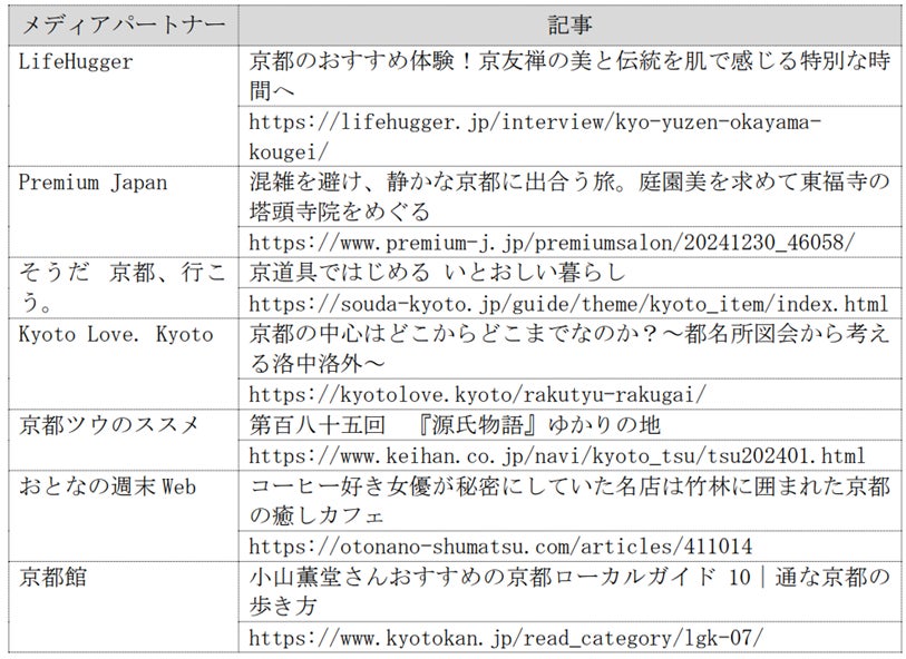 この度、持続可能な観光に資する優良な記事を表彰する「京都観光WEB記事大賞2024」において、WEBメディア運営事業者10社を、令和7年度のメディアパートナーとして認定するとともに、各事業者の記事の中から優秀記事を決定するため、読者投票を行います。