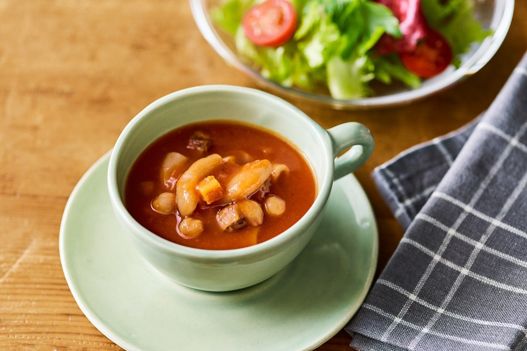 豆パスタや野菜、きのこがゴロゴロ入った、具だくさんの食べるスープ