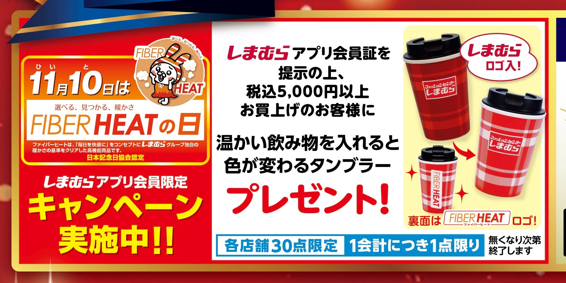 11/10(月)の『FIBER HEAT(ファイバーヒート)の日』を記念して、しまむらアプリ会員証をご提示のうえ、税込5,000円以上お買上げのお客様に、温かい飲み物を入れると色が変わるタンブラーをプレゼントします。各店30点限定、無くなり次第終了となります。