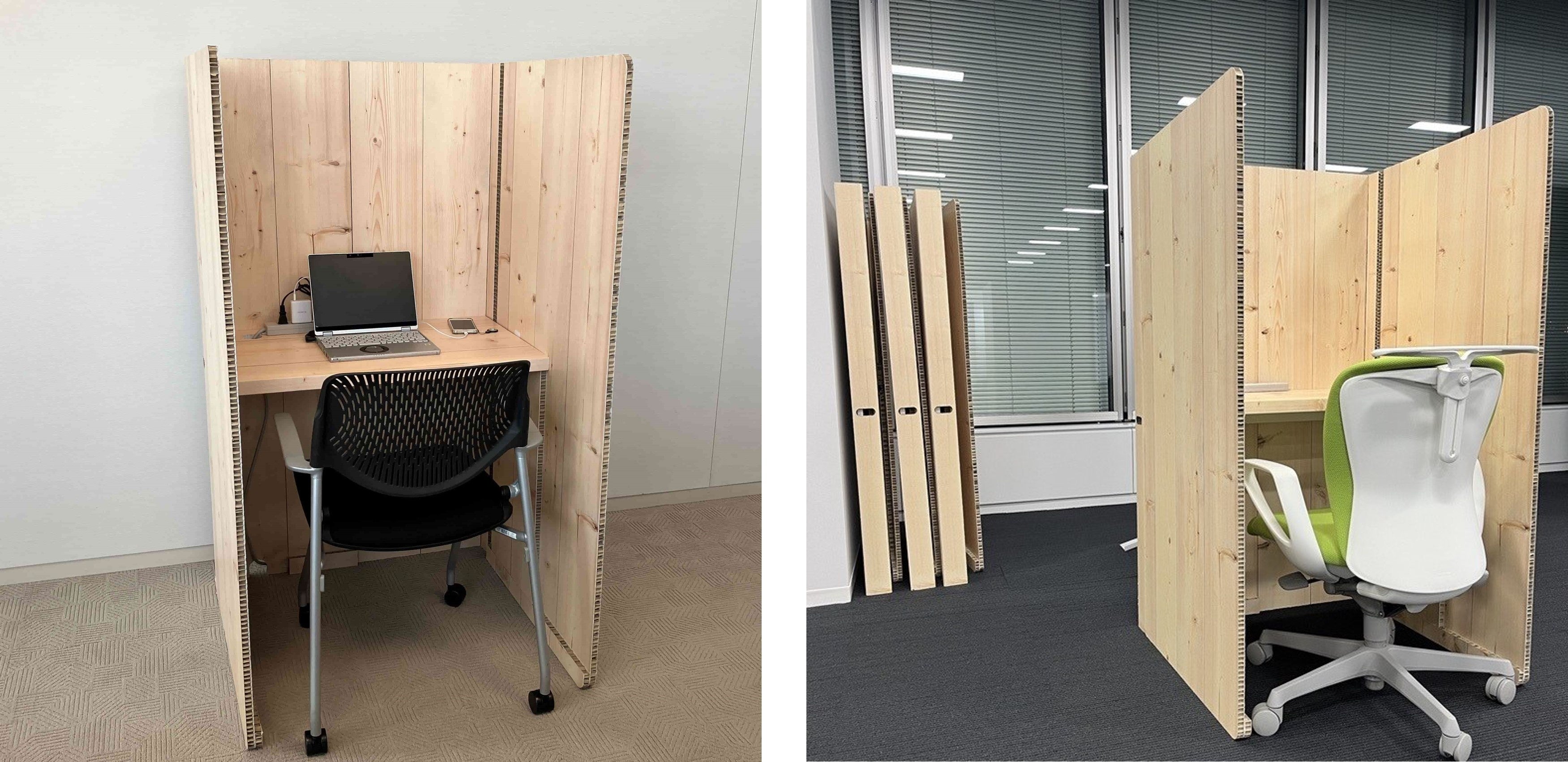 この製品は、金属やプラスチックを使用せずに、紙だけで構成する軽量な簡易型ブースで、10秒ほどで組み立てることができます。使用後は折りたたんでコンパクトに収納することが可能で、繰り返し使用できます。また、独自の「DNP 2.5D表現技術 リアルサーフェス®*2」(特許出願中)を使い、木目調などのパターンを印刷して立体感のあるリアルなデザイン表現を行い、落ち着いた空間を演出するなど、さまざまな空間に合わせたカスタマイズを行うことができます。