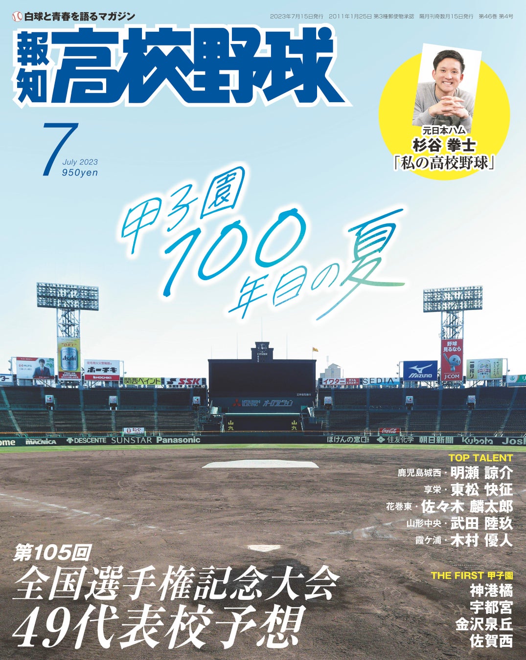 1924(大正13)年の甲子園球場開場から今年で100年目。巻頭では、ドラフト注目株の鹿児島城西・明瀬諒介内野手、享栄・東松快征投手をはじめ、高校通算最多本塁打を更新中の花巻東・佐々木麟太郎内野手、投打二刀流の山形中央・武田陸玖投手、最速150キロ右腕の霞ケ浦・木村優人投手(いずれも3年)ら節目の夏に必見の選手たちがズラリ。「THE FIRST 甲子園」と題して、1924年に甲子園で初めて開催された第10回大会の出場校である神港橘、宇都宮、金沢泉丘、佐賀西も特集。さらに、全国の本誌注目1、2年生を交え、甲子園49代表を争う各地方大会を大予想します。