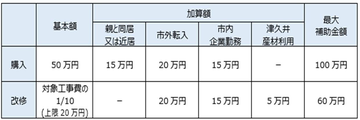 補助対象住宅を購入又は改修する場合、下表の金額を補助します。