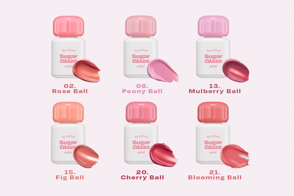 今回販売するカラーは全部で6色。リップポーションシュガーグレーズティント日本限定色として大人気なピオニーボールも、ミニサイズになって登場!