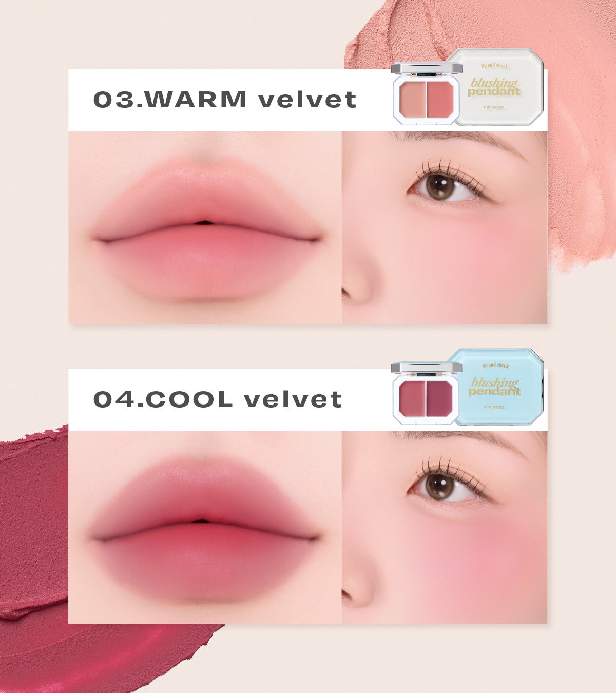 1つで2色のカラー展開で、リップにもチークにも使いやすいアイテムです。