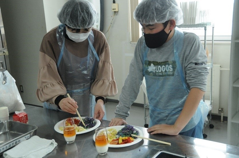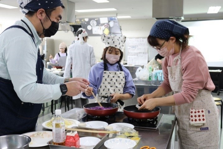 「うまみ三種」では、昆布、煮干し、鰹節からそれぞれだしをとり、官能検査を行いました。「ツートンミルクティー」では、砂糖を加えて密度を重くした牛乳と無糖紅茶で二層に分ける実験を行いました。「トリコロール焼きそば~ターメリックと紫キャベツを添えて~」では、通常の材料で作るとめんの色は本来の薄黄色になる塩焼きそばに、紫キャベツやターメリックを加えることによって、中華めんに含まれるかん水の影響で、それぞれめんの色が青色と赤色に変化する様子を確認してもらいました。