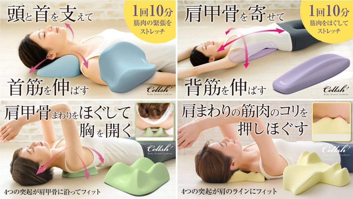 そんな方必見!肩まわりの筋肉のコリほぐしとストレッチが、ひとつになった新しいクッション「Cellsh肩ストレッチクッション」をご紹介します!