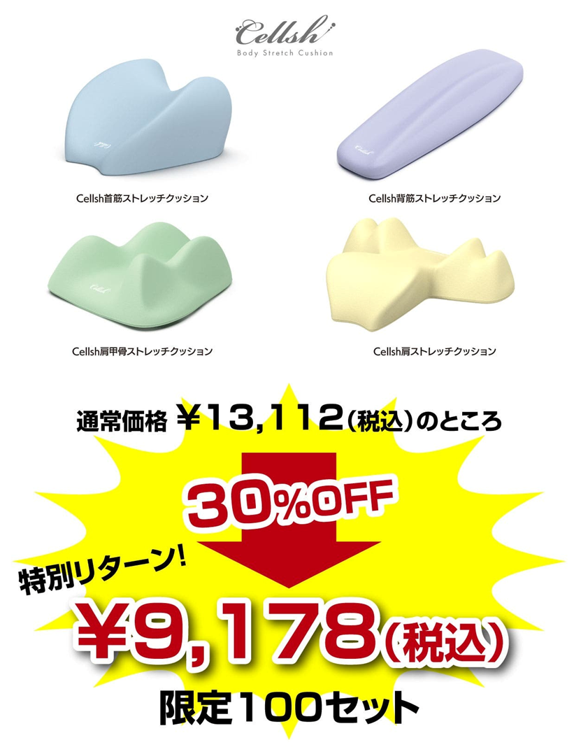 この感謝の気持ちを込めて、大ヒット感謝企画として、これまでに発売した3種類のクッションと、今回新たに登場した「Cellsh肩ストレッチクッション」をセットにした 特別リターンセットをご用意しました。限定100セットのみとなりますので、お早めにお求めください!