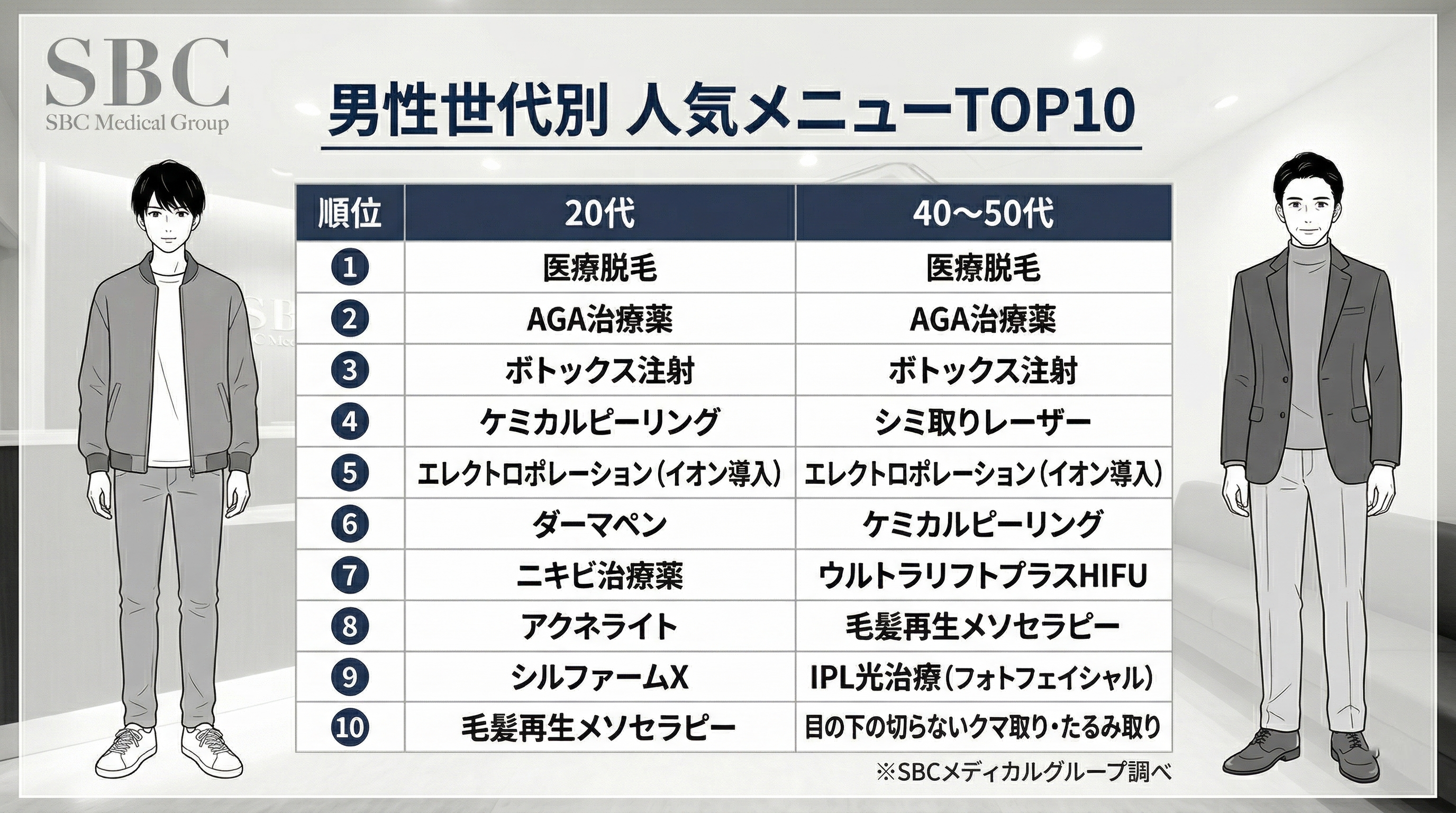 20代と40〜50代男性の人気メニューTOP10を比較したところ、上位3項目は両世代で共通して「医療脱毛」「AGA治療薬」「ボトックス注射」となりました。また、「ケミカルピーリング」「エレクトロポレーション(イオン導入)」といった肌質改善の基礎治療も両世代でランクインしており、年代を問わない共通ニーズの存在が確認されました。