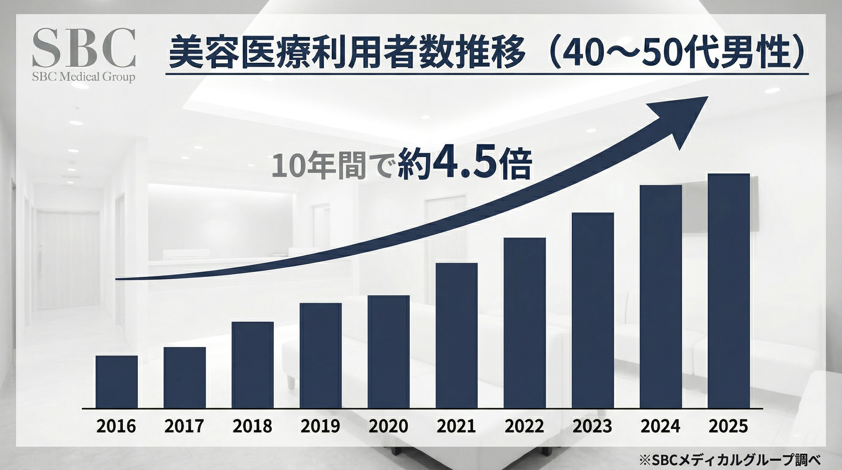 こうした動きは若年層にとどまらず、40〜50代のミドル層男性にも広がっています。湘南美容クリニックをはじめ、SBCが経営支援を行うクリニックにおける同年代男性の利用者数は、過去10年間で