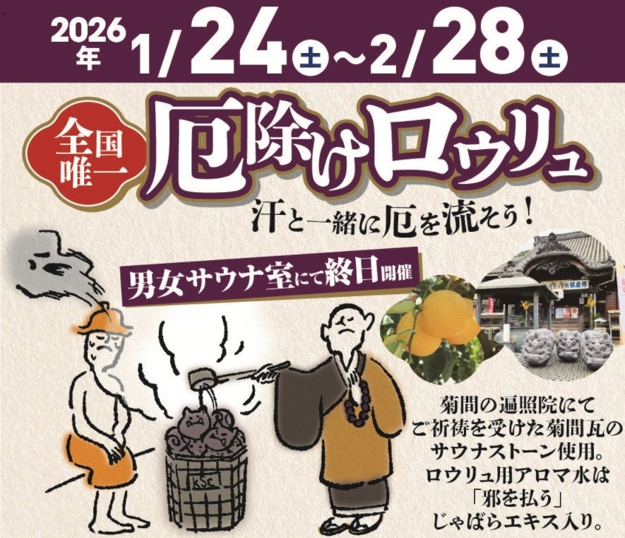 キスケ株式会社(本社:愛媛県松山市、代表取締役:山路義則)が運営する「伊予の湯治場 喜助の湯」「しまなみ温泉 喜助の湯」は、2026年1月24日(土)〜2月28日(土)の期間、新年の厄を払う恒例企画『厄除けロウリュ』を開催いたします。昨年は61,000人が来場した、喜助の湯の冬の名物企画です。