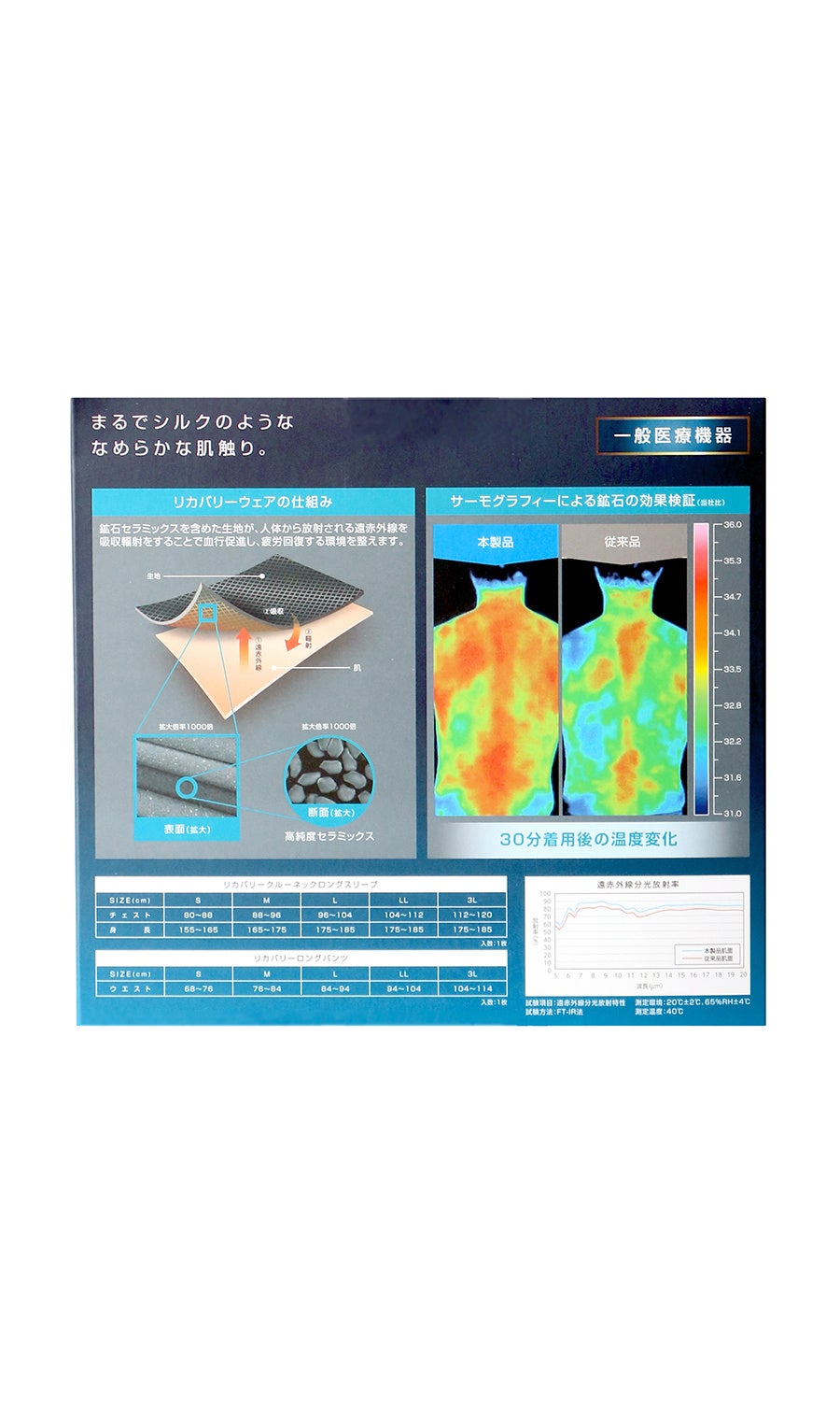 ※リカバリーウエアとは、一般医療機器「家庭用遠赤外線血行促進衣」の届け出をした疲労回復ウエアのことです。