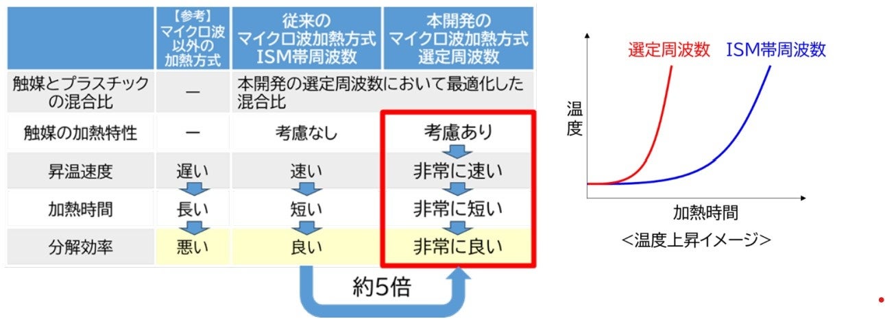 1.触媒の加熱効率が高い周波数を新たに選定するとともに、プラスチックと触媒の混合比を最適化する技術により、世界最高となる従来比約5倍の分解効率を実現