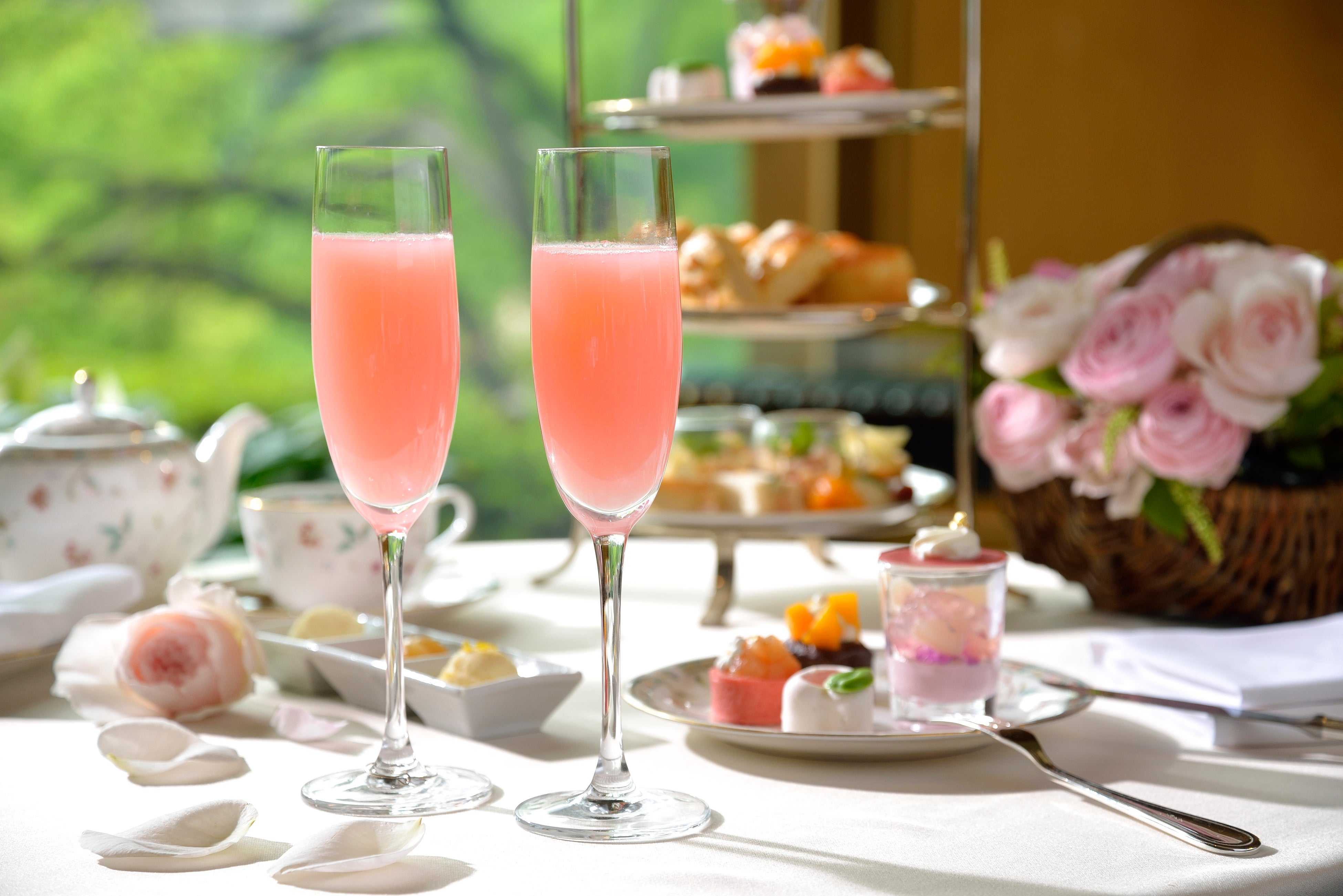 ウエルカムドリンク付きプランでは、冷やしたスパークリングワインと桃の上品で爽やかな味わいのカクテル「ベリーニ」を提供いたします。見た目もピンク色で可愛らしいカクテルを、アフタヌーンティーと一緒にぜひお楽しみください。