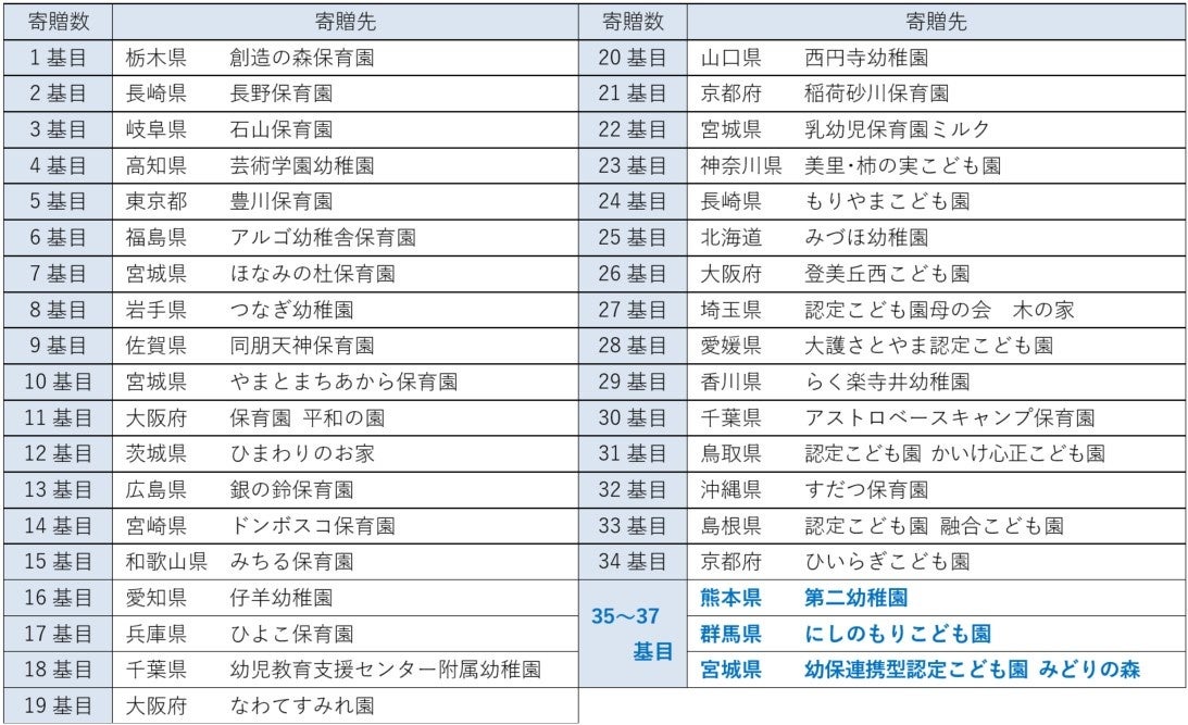 寄贈先は29都道府県37園になります。青字は今回寄贈が決定した園です。