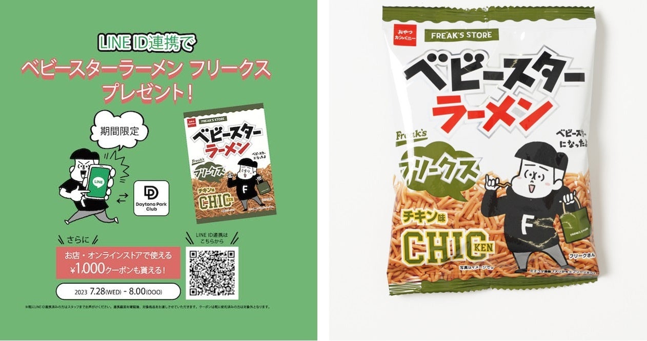 7月28日から、FREAK'S STOREの公式オンラインストア「Daytona Park」にて購入いただいた2万名様に先着でFREAK'S STORE限定のコラボパッケージが同梱される他、店頭ではLINE ID連携をしていただいた先着1万名のお客様にも同様のコラボパッケージのベビースターラーメンをプレゼントいたします。