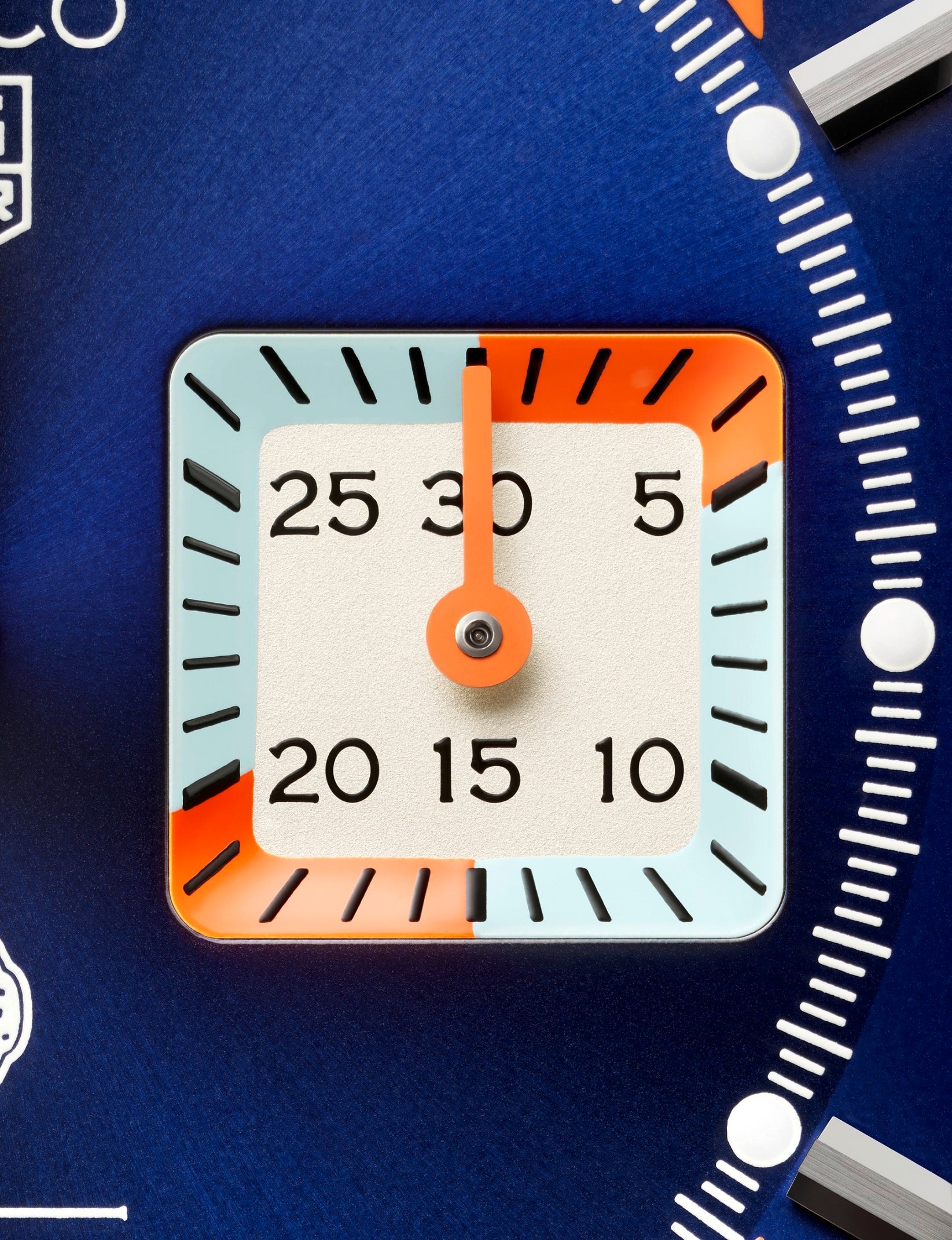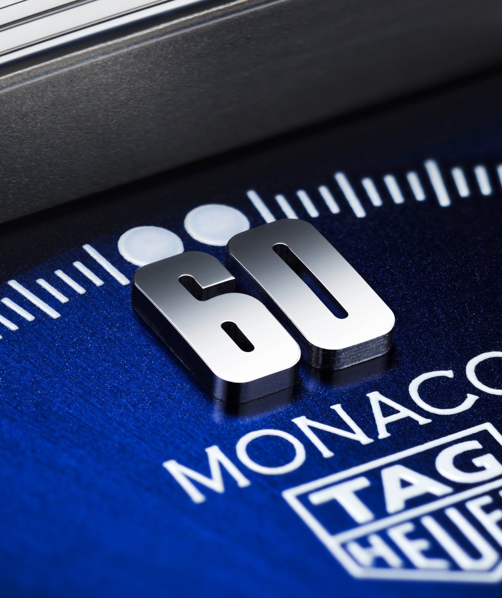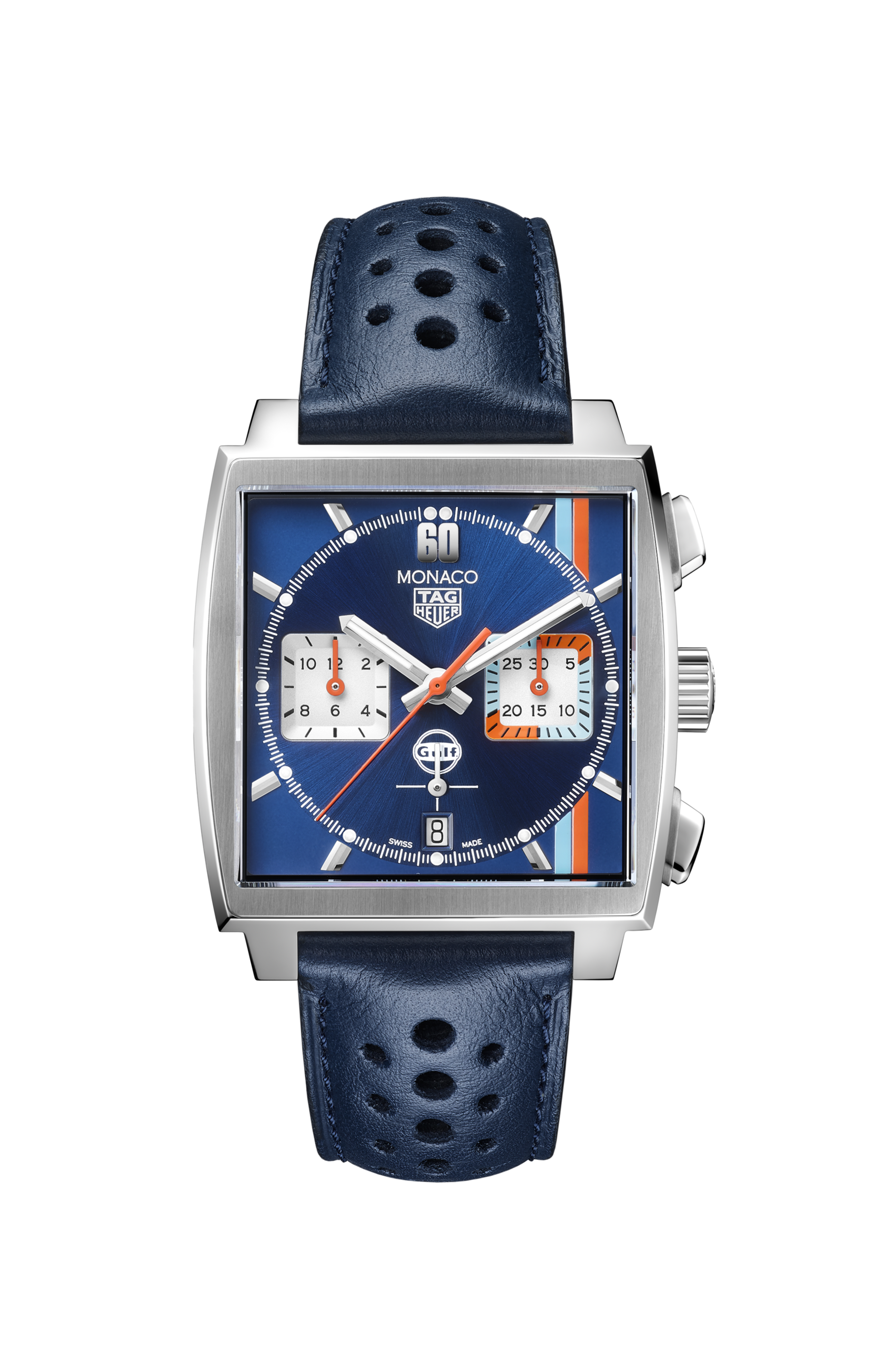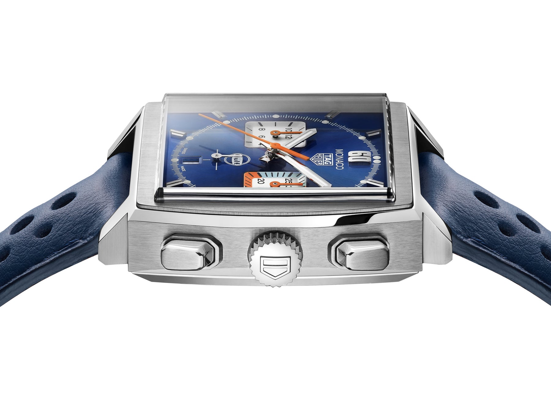 ダイヤルでは、ガルフのスマートなタッチがモナコの洗練された面持ちとひとつになり、エレガントに表現されています。また今回初めて3つのカラーが3時位置の分表示用サブダイヤルにも採用されています。ダイヤルにあしらわれたガルフのロゴが完全なホワイトで描かれている点も、今回が初めてです。