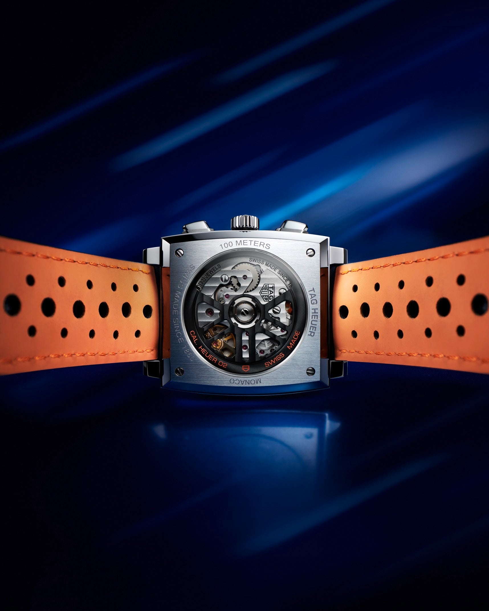 ポリッシュ仕上げとロジウム加工で仕上げたこの数字は、ポルシェ ガルフ レーシングカーのレーシングナンバーを彷彿とさせます。そして「タグ・ホイヤー モナコ キャリバー ホイヤー02 クロノグラフ ガルフ スペシャルエディション」の背面には、ガルフのオレンジカラーと合うようにローターとコラムホイールに特別なエングレービングを色付きであしらって個性を出しました。
