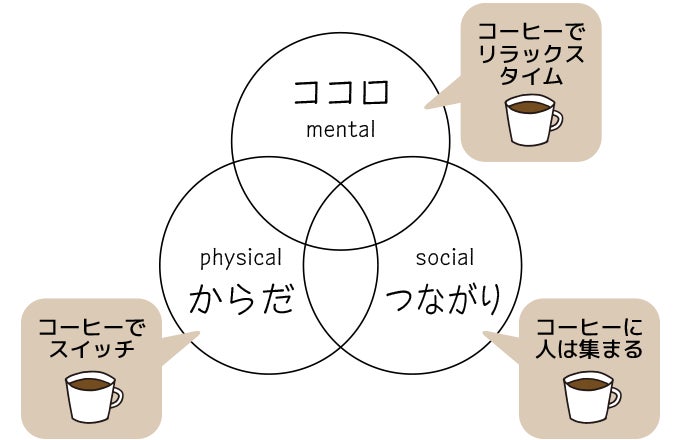 単に健康かどうかだけではなく、長い人生に対する満足度を高めるためには「ココロ」「からだ」「人とのつながり」がバランスよく揃っていることが大切であり、コーヒーはその3つの要素に働きかける、有効な飲み物なのではないかと考えられています。日本で調査すると、コーヒーの杯数と人生の満足度には「正の相関」があり、特に1日3杯以上飲んでいる方は、人生に対する満足度が高い傾向にあるようです。
